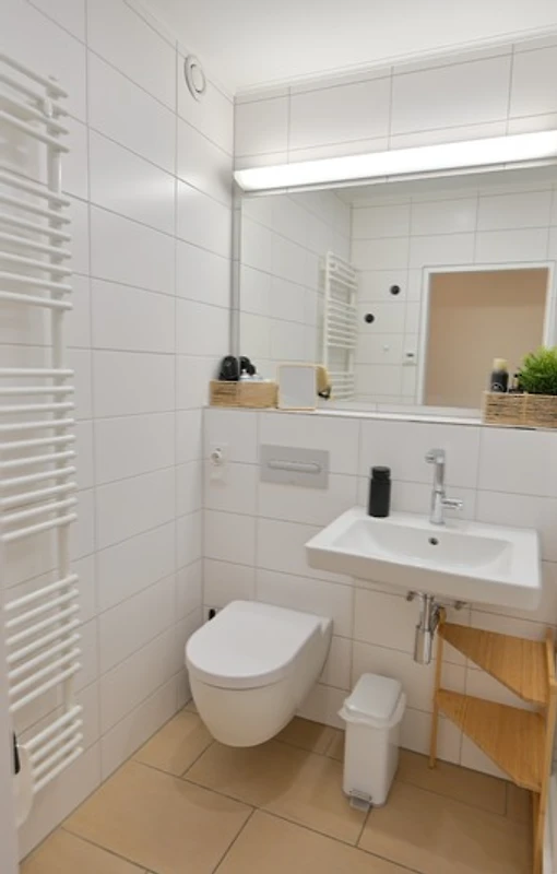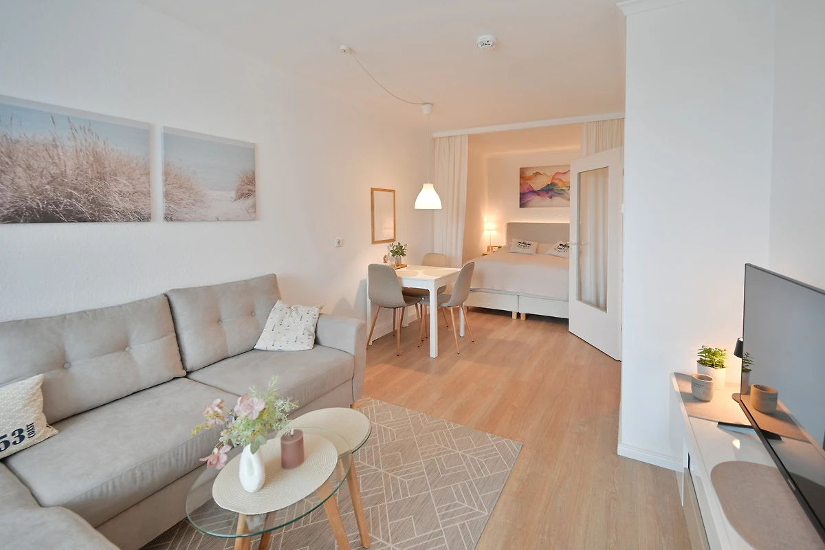 Der helle und grosszügig gestaltete Wohn- und Schlafbereich lädt zum Entspannen ein. Neben einem gemütlichen Sofa und einem Smart-TV steht Ihnen ein Boxspringbett (160 × 200 cm) im optisch abgetrennten Schlafbereich zur Verfügung. Ein Esstisch rundet den Wohnbereich ab.