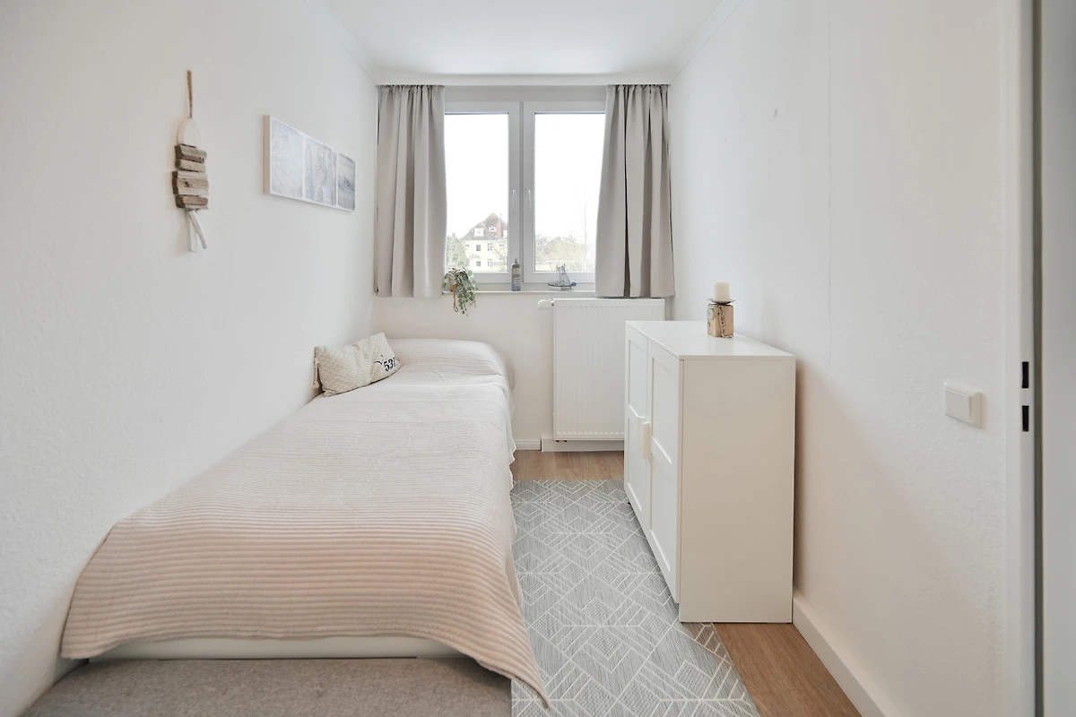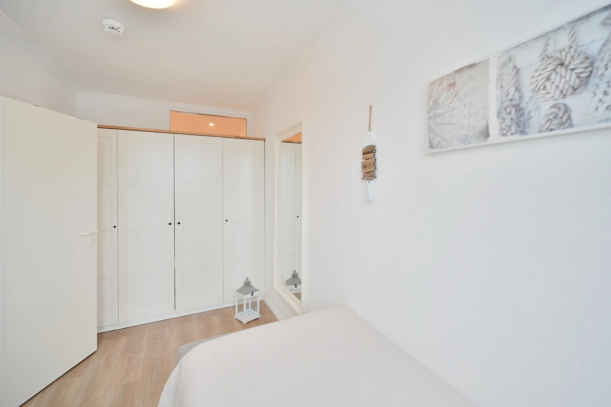 Das Gästezimmer ist ebenfalls hell und gemütlich eingerichtet. Hier befindet sich die dritte Schlafmöglichkeit (Einzelbett 80 × 200 cm). Ausserdem sind in diesem Raum die Kleiderschränke mit ausreichend Stauraum untergebracht.