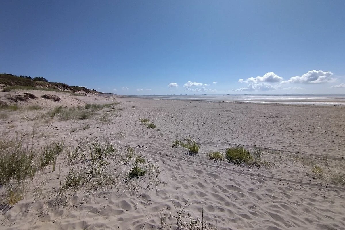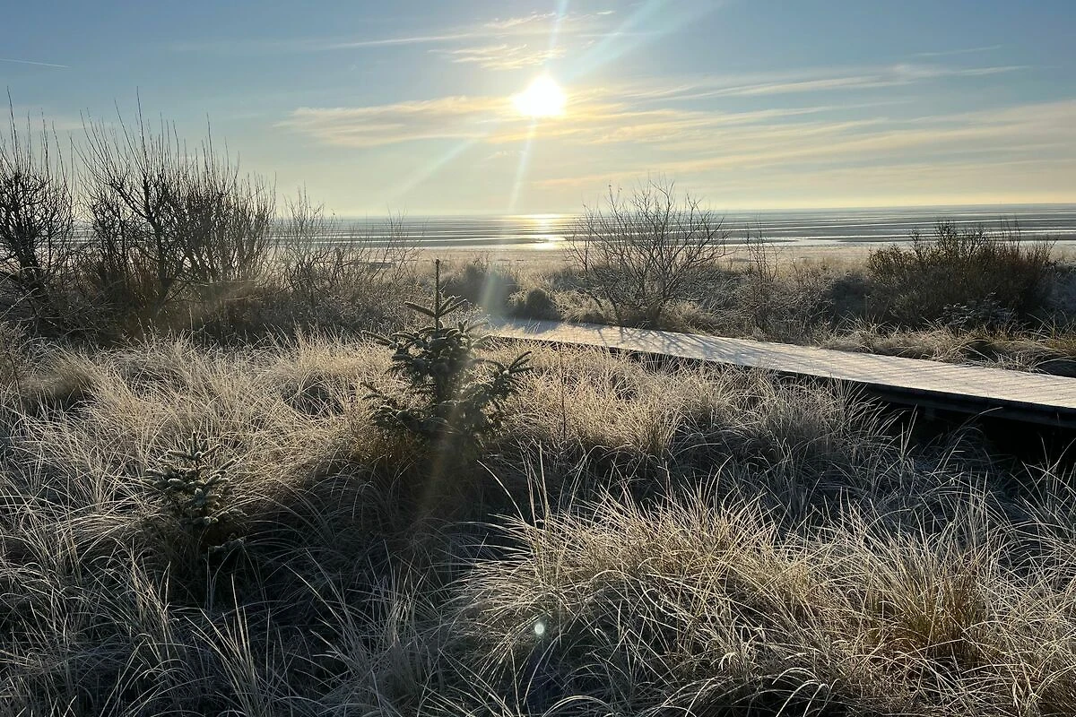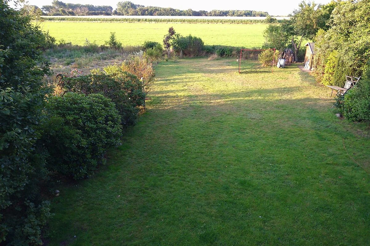 Das Haus befindet sich in einer Sackgasse in der letzten Häuserreihe zum Strand. Der Garten ist in Richtung Süden zum Meer hin ausgerichtet. Hinter dem Grundstück befinden sich Felder bis zum Deich - und dahinter kommt gleich der Strand und das Meer. Das Grundstück ist somit sehr ruhig gelegen. Bei Hochwasser lassen sich aus dem Zimmer im Obergeschoss vorbeifahrende Schiffe auf der Nordsee beobachten.