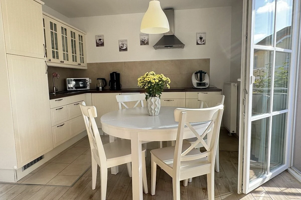 Der offene Küchenbereich bietet Ihnen neben einem Cerankochfeld, Geschirrspüler, Kühlschrank mit Gefrierfach auch eine Mikrowelle, Kaffeemaschine, Wasserkocher und ein Thermomix (ohne Gewähr und auf Anfrage).