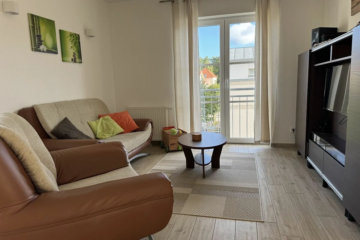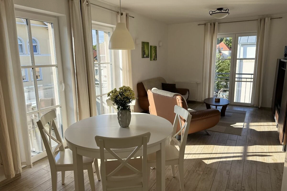 Der freundliche Wohnbereich bietet eine gemütliche Sitzecke mit Sofa und Sessel, einen LCD-Fernseher sowie direkten Zugang zum sonnigen Südwest-Balkon ausgestattet mit Tisch und 4 Stühlen. Ideal für entspannte Stunden an der frischen Ostseeluft.