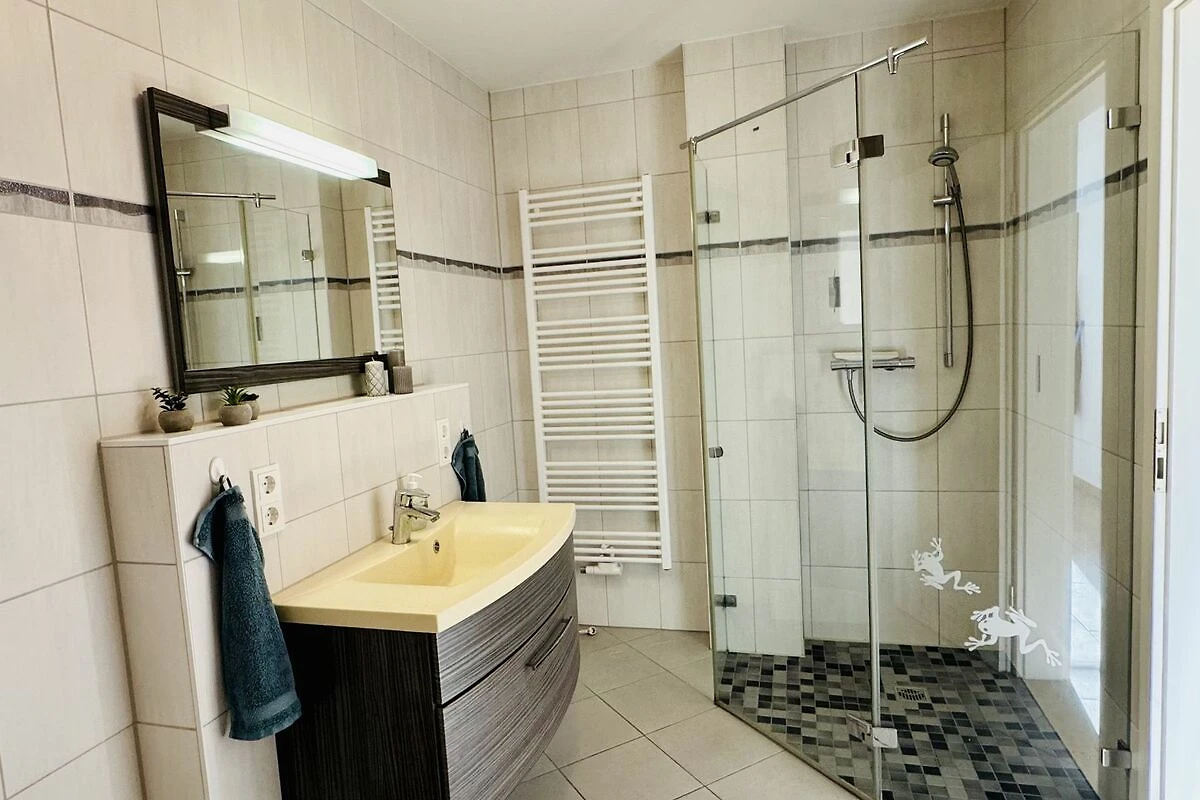 Das Bad hat eine grosse ebenerdige Echtglas-Dusche, ein WC, eine Waschmaschine sowie einen Fön.