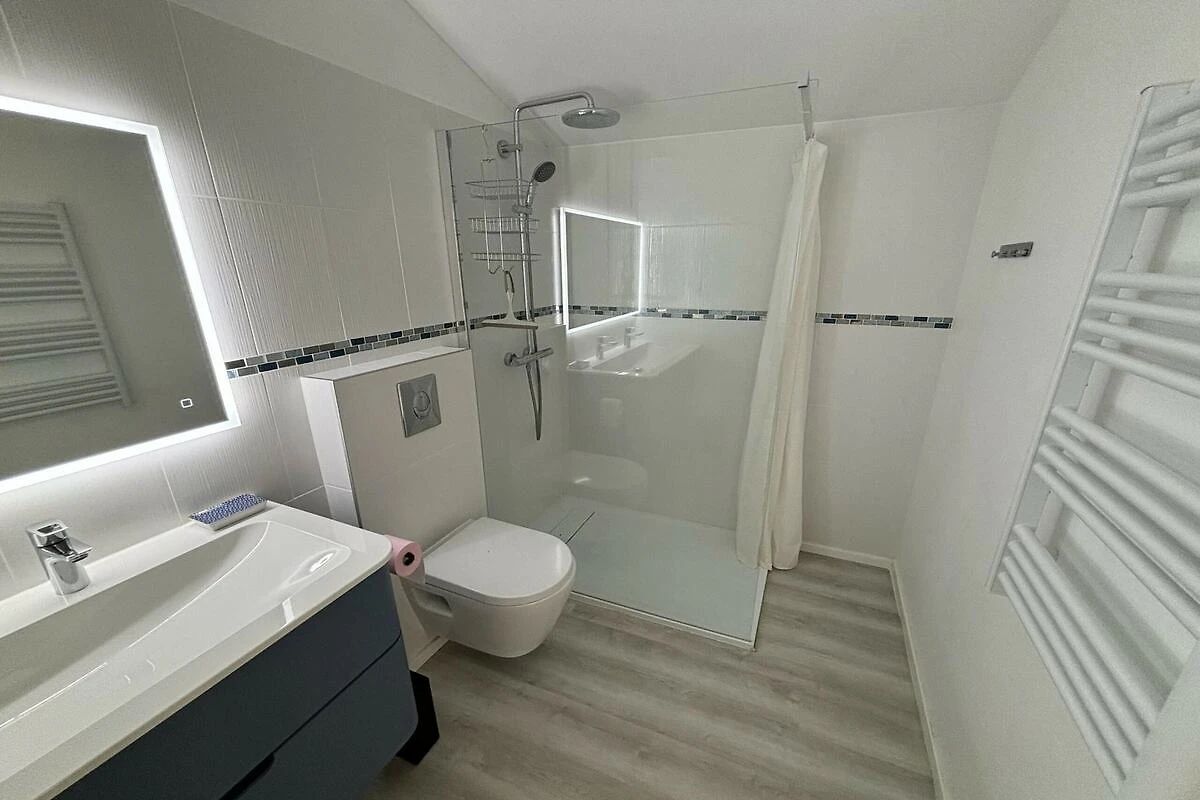 Parterre: (Wohnzimmer(TV, Esstisch(8 Personen), Sitzecke(8 Personen), ), Küche(Backofen, Mikrowelle, Spülmaschine, Kühl-/Gefrierkombination, , ), Schlafzimmer mit Badezimmer(Doppelbett, Dusche, Waschbecken, Toilette, Klimaanlage, Föhn), Schlafzimmer mit Badezimmer(Doppelbett oder 2 Einzelbetten, Dusche, Waschbecken, Waschbecken, Toilette, Waschmaschine, Klimaanlage, Föhn))