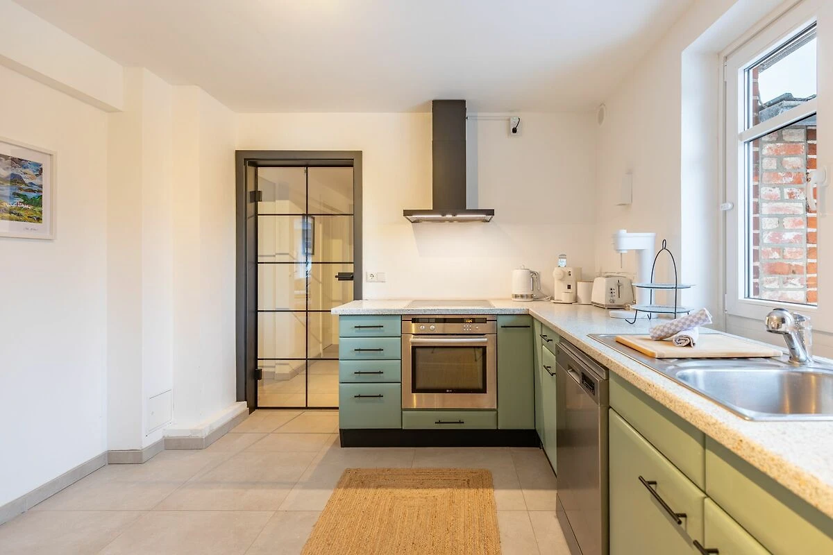 Die voll ausgestattete Küche eignet sich auch bestens für längere Aufenthalte: Ceran-Kochfeld, Backofen, Kühlschrank mit Gefrierfach, Spülmaschine sowie Espressomaschine, Wasserkocher, Toaster und Mixer sind vorhanden. Geschirr, Besteck, Küchenutensilien, Geschirrhandtücher, Gewürze und Abfalleimer stehen ebenfalls bereit.