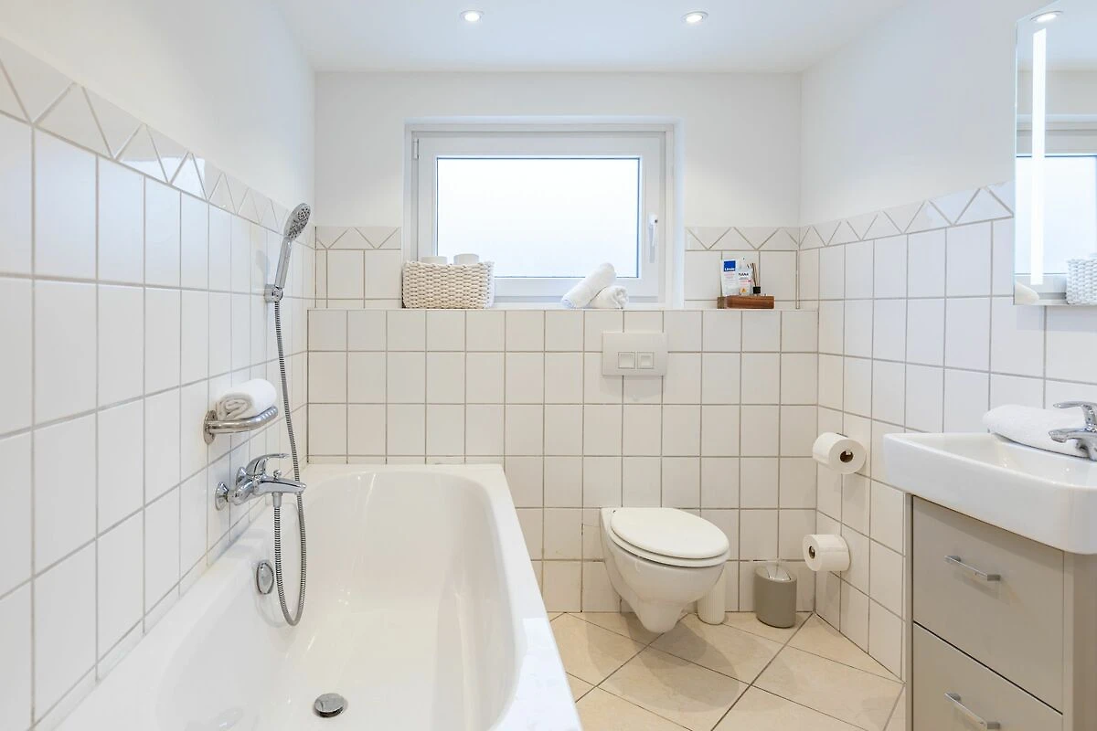 Im unteren Badezimmer befinden sich Dusche und Badewanne, WC, Waschbecken, Spiegel, Fenster, warmes Wasser und ein Haartrockner.