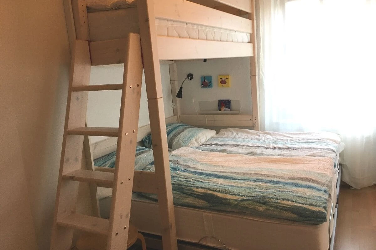 Mit den zwei separaten Schlafzimmern eignet sich die Ferienwohnung hervorragend für Familien mit Kindern, aber auch für zwei Paare oder bis zu 5 Erwachsene. In Schlafzimmer 1 finden Sie ein Doppelbett (180x200, zwei Matratzen) mit zwei verstellbaren Lattenrosten. Das zweite Schlafzimmer ist mit einem Hochbett ausgestattet (100 x 200). Unten gibt es zwei Betten (je 90 x 190), die als Doppelbett oder zwei Einzelbetten benutzt werden können. Auf Anfrage stellen wir zudem gerne ein Babybett gegen Gebühr bereit.