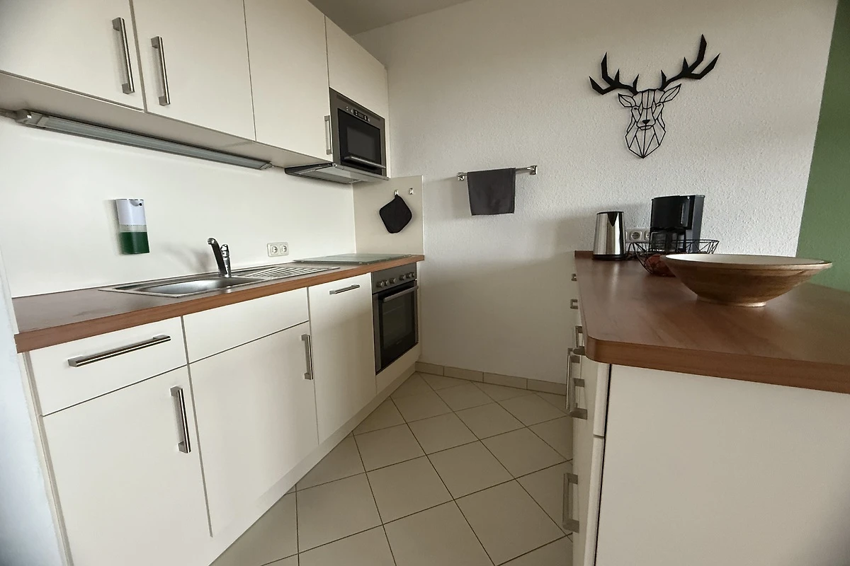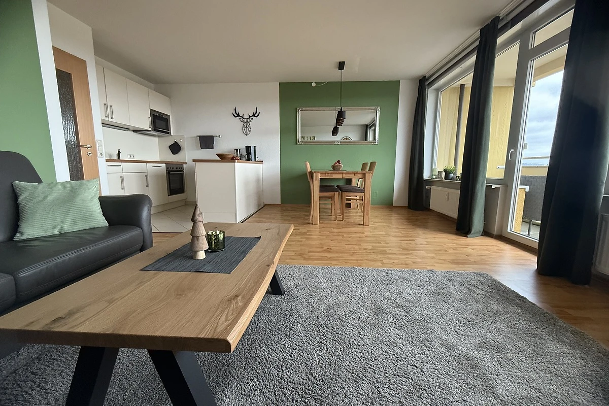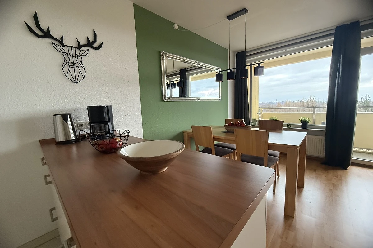 Die offene Küche verbindet Funktionalität mit Stil. Backofen, Mikrowelle und Spülmaschine erleichtern das Kochen, während der großzügige Esstisch zum gemeinsamen Genießen, Lachen und Erzählen einlädt. Vielleicht starten Sie den Tag mit einem Frühstück, während sich die ersten Sonnenstrahlen auf dem Balkon über den Hügeln des Harzes spiegeln.