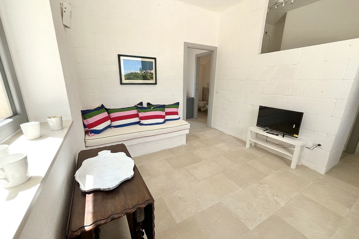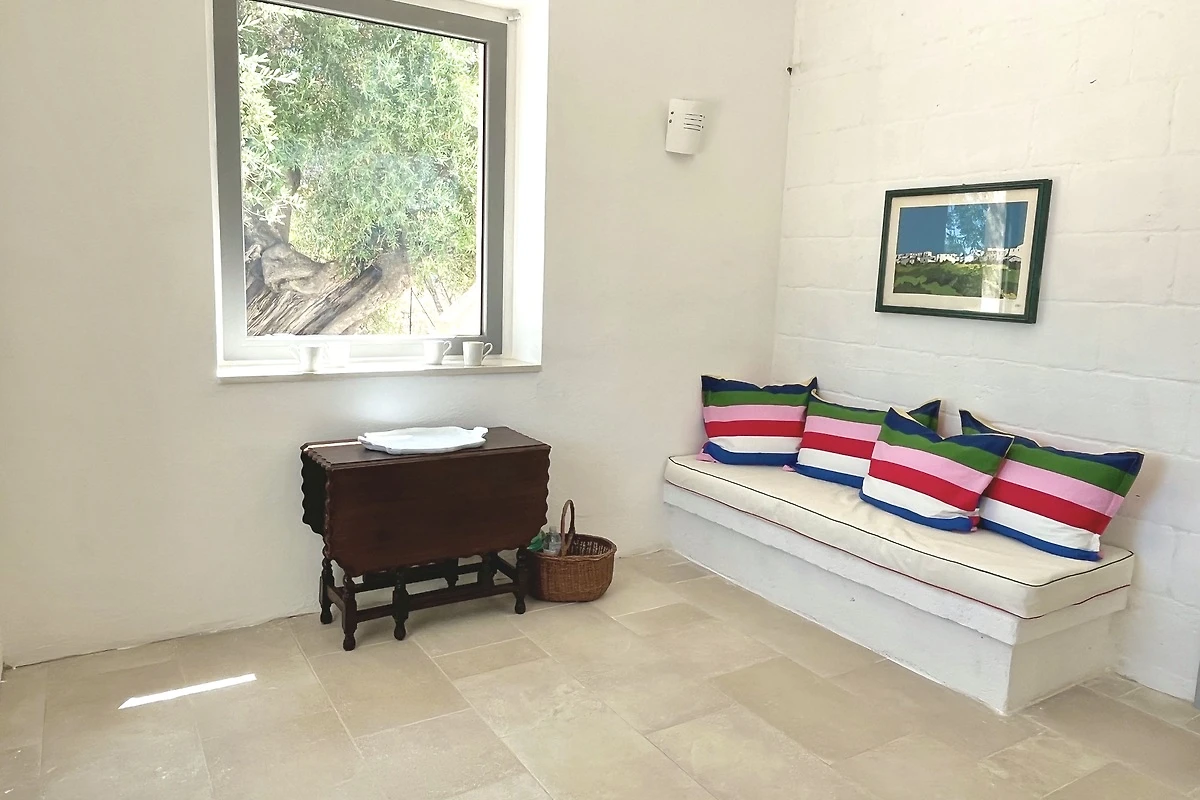 Das anmutige Tuffsteinhaus Ulivi & Mare vereint traditionelle Baukunst mit modernem Komfort, wodurch ein harmonisches Wohnambiente entsteht, das sowohl zeitlos als auch einladend wirkt. Mit farbenfrohen Kissen, apulischer Keramik, antiken Wandfliesen und gemauerten Sitzbänken im Innen- wie Außenbereich entfaltet sich eine luftige, mediterrane Wohnlichkeit, die zum Wohlfühlen einlädt.