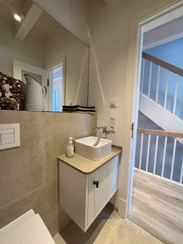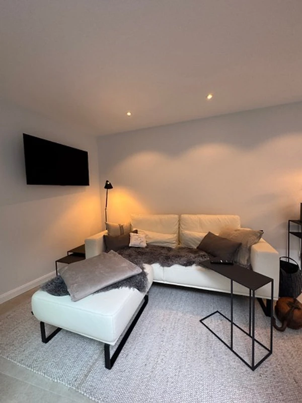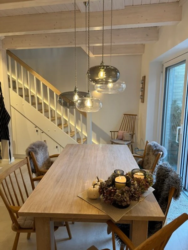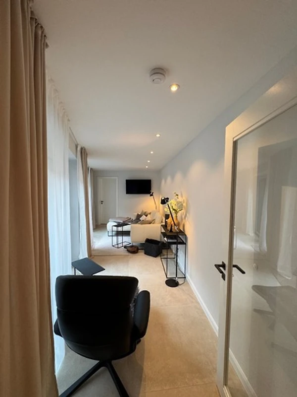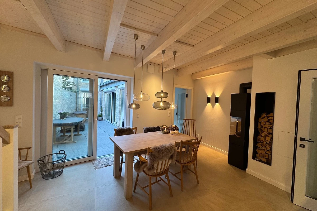 Ganz oben, im Spitzboden, öffnet sich das grosszügige Wohnzimmer - Ihr Rückzugsort über den Dächern Eckernfördes. Eine weiche Sofalandschaft, warme Farben und der Blick auf das Silo und einen Zipfel des Hafens - hier lässt sich die Seele treiben. Vielleicht mit einem Glas Wein, einem guten Buch, oder einfach in Stille.