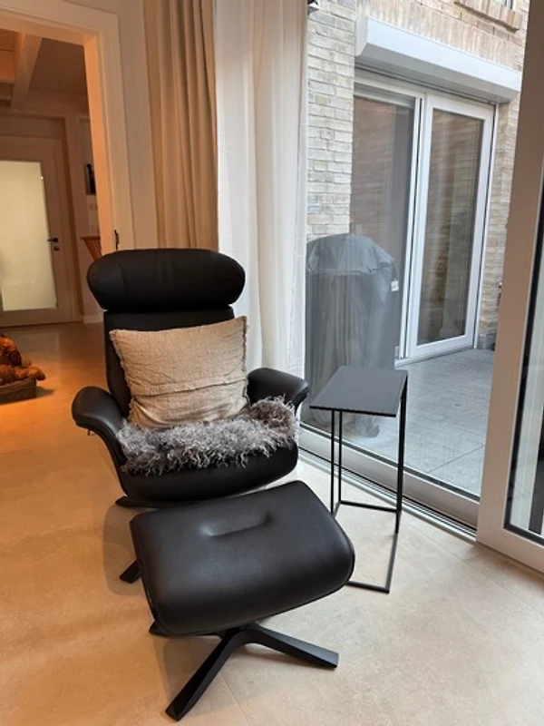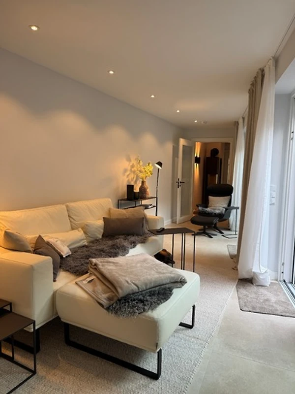 Das anschliessende Wohnzimmer, lichtdurchflutet und ruhig, verbindet das Vorder- mit dem Hinterhaus. Warme Töne, ein Ledersofa, sanft wechselndes Licht - ein Raum, der zum Verweilen einlädt. Hier trifft handwerklicher Luxus auf unaufdringliche Eleganz.