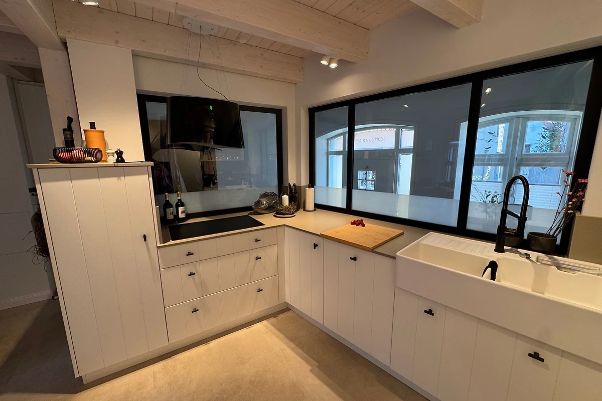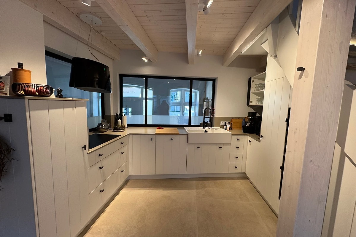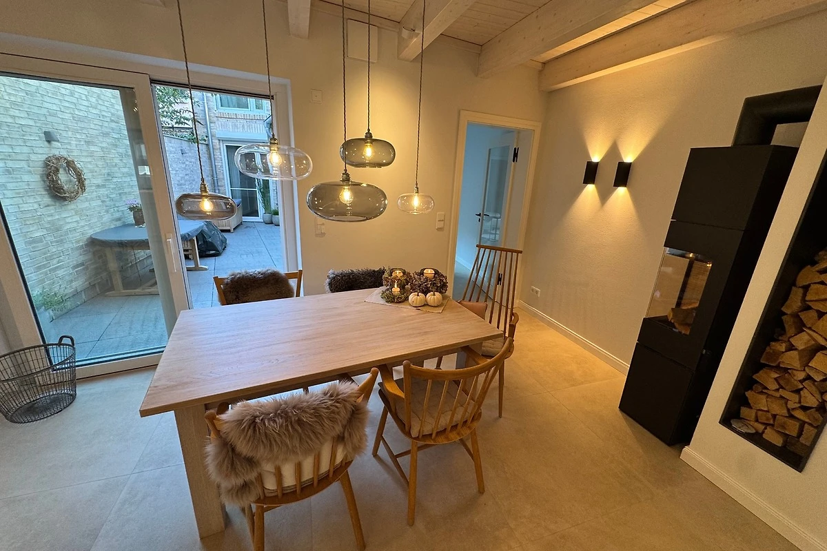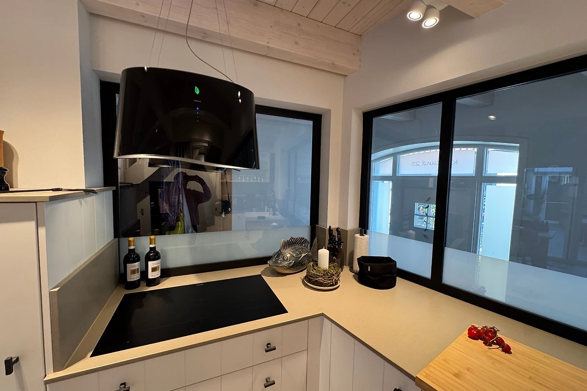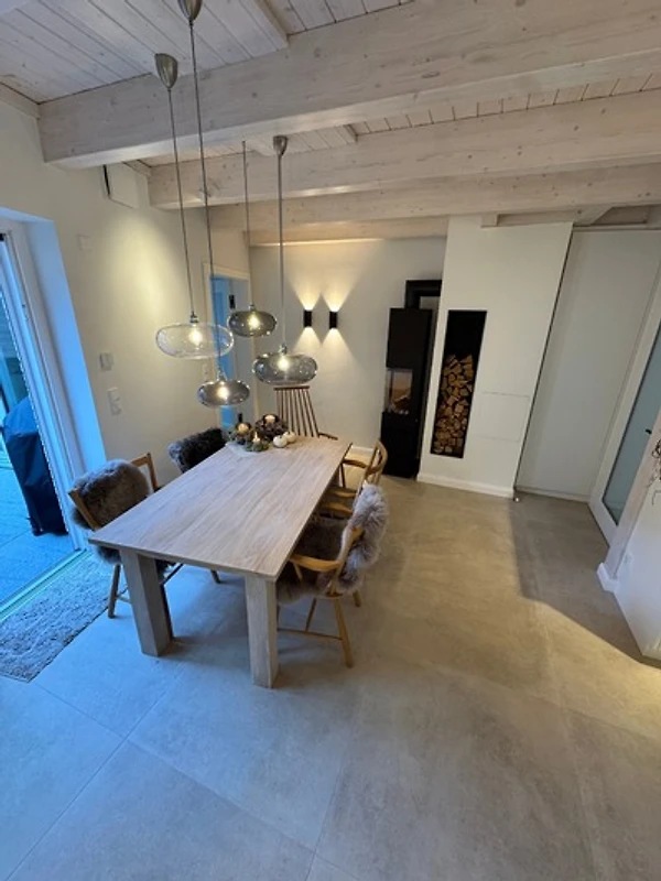 Durch die zweite Tür betreten Sie die Wohnküche - das Herzstück des Hauses. Sanftes Licht, edle Materialien, ein Kaminofen - hier fühlt man sich sofort zuhause. Die massgefertigte Küche aus Tischlerhand mit Steinarbeitsplatte vereint luxuriöse Ausstattung mit zeitloser Ästhetik: zwei Backöfen, ein grosses Kochfeld mit sechs Zonen, eine Wärmeschublade und ein Kühl-Gefrier-Kombigerät. Edles Geschirr, feine Gläser und eine erlesene Auswahl an Kochutensilien machen Kochen und Geniessen zu einem Erlebnis.