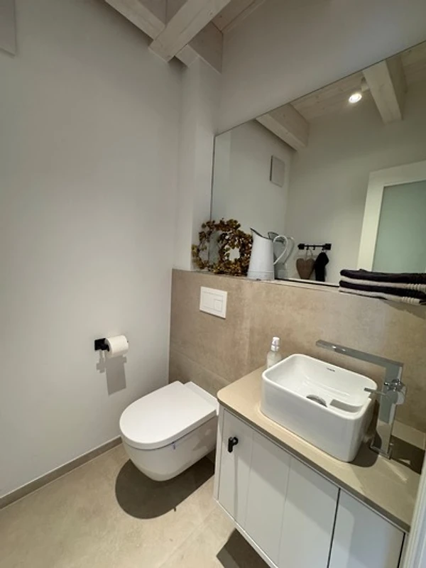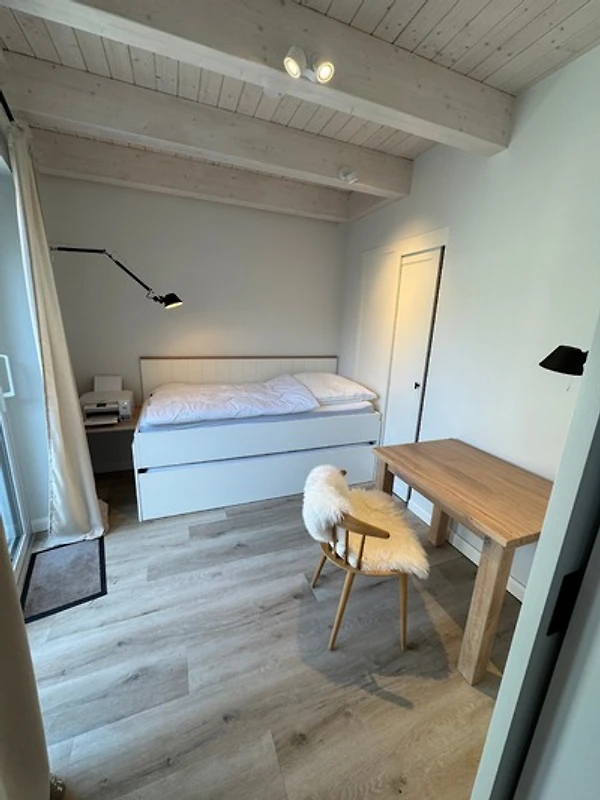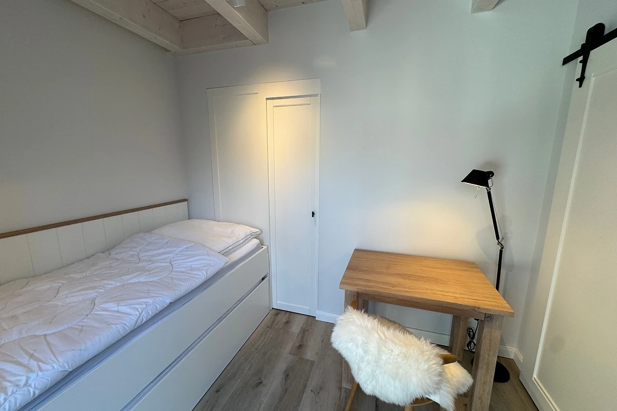 Im ersten Stock des Vorderhauses liegen zwei weitere Schlafzimmer - eines mit Doppelbett, das andere mit Einzelbett und Schreibtisch - ideal, wenn Arbeit und Erholung sich begegnen dürfen. Das angrenzende Badezimmer überzeugt durch moderne Schlichtheit, Licht und Komfort.