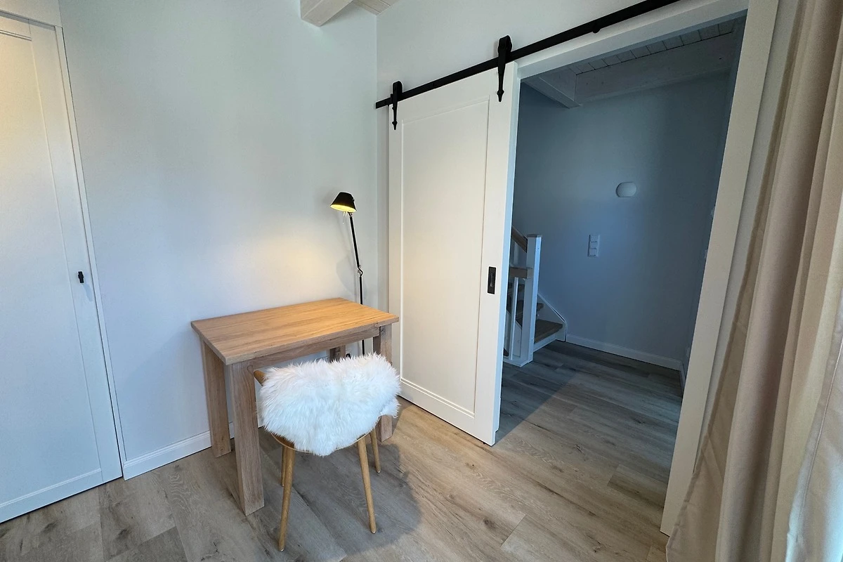 Im ehemaligen Pferdestall, heute das Hinterhaus, befindet sich eines der beiden Doppelschlafzimmer: ein Rückzugsort aus Holz, Stoff und Stille. Massgefertigte Möbel, hochwertige Stoffe und gedämpfte Farben schaffen eine Atmosphäre von Geborgenheit und reduzierter Schönheit. Das dazugehörige Bad, clever unter die Treppe integriert, besticht durch raffinierte Nutzung des Raums, klare Linien und hochwertige Armaturen.