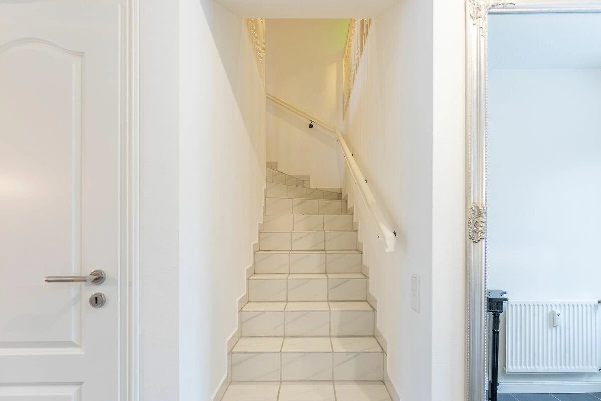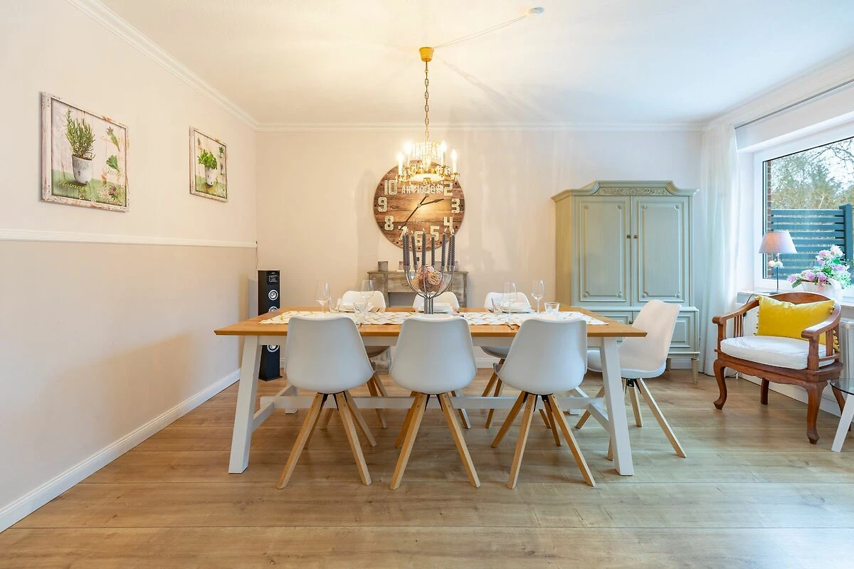 Im Inneren erwarten Sie sechs Räume mit klar gegliederten Wohn- und Essbereichen. Wohnzimmer, Esszimmer und eine separate Sofaecke laden zum Entspannen ein. Zur Unterhaltung stehen Ihnen ein SMART- TV im Wohnzimmer, Radio, CD-Spieler, HiFi-Anlage sowie WLAN zur Verfügung. Bücher und Spiele ergänzen das Angebot. Praktische Ausstattungsdetails wie Garderobe, Schreibtisch, Sessel, Kommode, Wäscheständer, Staubsauger sowie Bügeleisen und -brett sorgen für Komfort im Alltag.