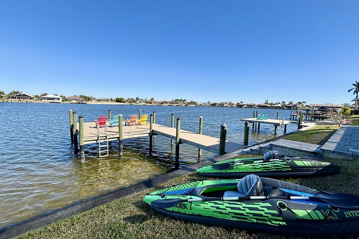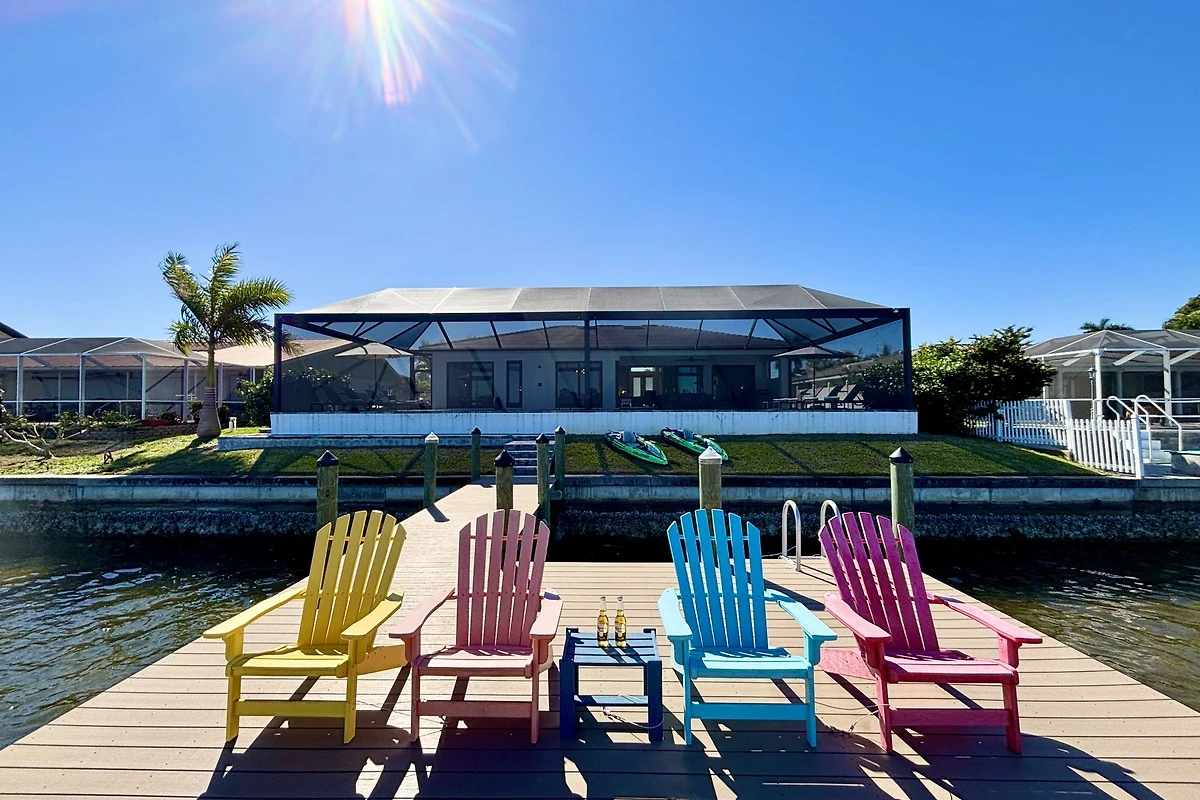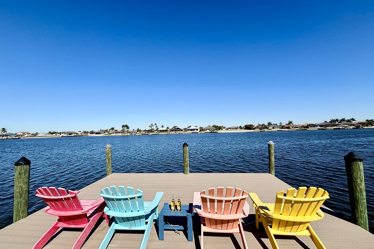 Am großzügigen Steg mit komfortablen Stühlen lassen sich stimmungsvolle Sonnenuntergänge direkt am Wasser genießen oder entspannte Stunden beim Angeln verbringen. Ein Mietboot kann problemlos am Steg festgemacht werden. Von hier aus erreichen Sie den Caloosahatchee River ohne Schleuse, und je nach Boot, Route und Wetterbedingungen beträgt die Fahrzeit bis zum Golf von Mexiko etwa 30 Minuten. Die Boote zur Auswahl finden Sie direkt unter der Lagekarte. Bei Buchung können Sie das gewünschte Boot auswählen.