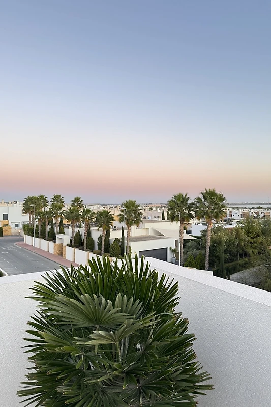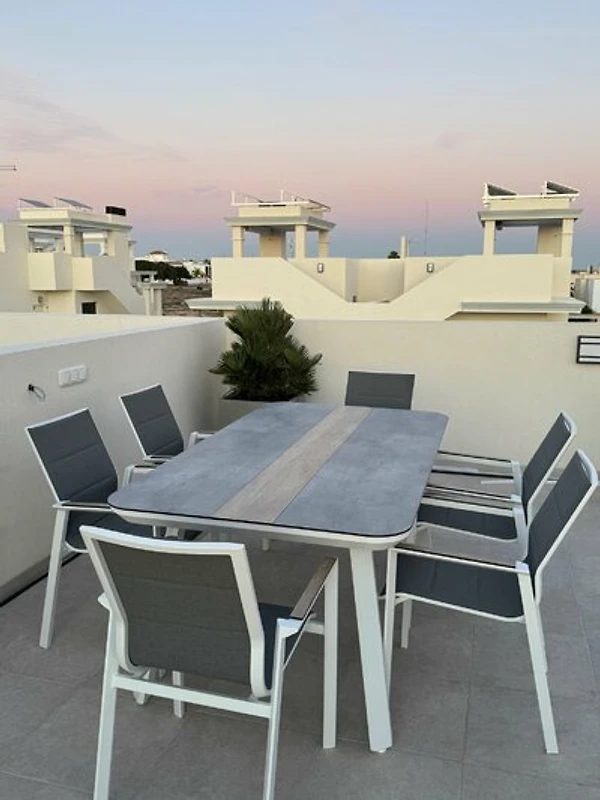 Genießen Sie Ihren Urlaub in der Sunset Adhara Penthouse Ferienwohnung in Rojales an der Costa Blanca! Die 80 m² große Wohnung bietet Platz für 4 Gäste und verfügt über 2 Schlafzimmer sowie 2 Badezimmer – ideal für einen entspannten Familienurlaub, einen sportlichen Aufenthalt oder sonnige Tage am Strand. Vom Balkon und der Terrasse aus erleben Sie einen atemberaubenden Panoramablick, während Sie den BBQ-Grill nutzen oder im Pool entspannen. Ein reservierter Parkplatz steht Ihnen zur Verfügung. Die voll ausgestattete Küche lässt mit 4-Platten-Herd, Induktionskochfeld, Backofen, Cerankochfeld, Mikrowelle, Kühlschrank, Gefrierfach, Geschirrspüler, Wasserkocher, Kaffeemaschine, Toaster und Dunstabzugshaube keine Wünsche offen; Geschirr und Bettwäsche sind selbstverständlich vorhanden. Für Ihren Komfort sorgen Klimaanlage, Fußbodenheizung, TV, kostenloses WLAN, Waschmaschine, Bügeleisen und Föhn. Handtücher sind inklusive. Erleben Sie Aktivitäten wie Radfahren, Golf, Mountainbiken, Reiten, Schwimmen oder Wandern – ein Paradies für Sportbegeisterte und Naturliebhaber. Das Nichtraucher-Penthouse eignet sich auch für einen längeren Aufenthalt. Ob Urlaub am Meer, am nahegelegenen See oder einfach zum Erholen – hier finden Sie Ihr perfektes Feriendomizil!