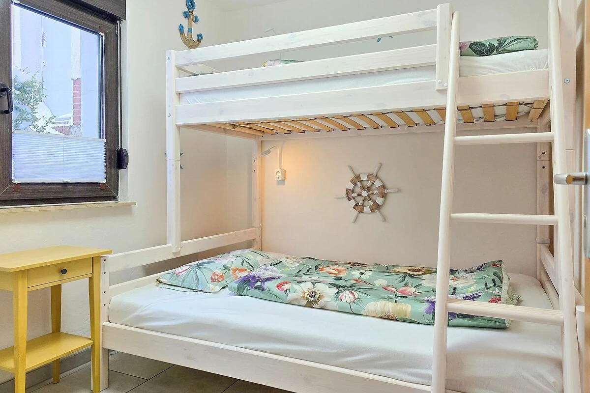 - Ein Schlafzimmer mit Doppelbett und grossem Kleiderschrank und Kommode. Ein weiteres Schlafzimmer mit Etagenbett. Das untere Bett hat ein Grösse von 1,40 x 2 Meter, die obere Liegefläche von 0,90 x 2 Meter und kann bis max. 60 Kg belastet werden.