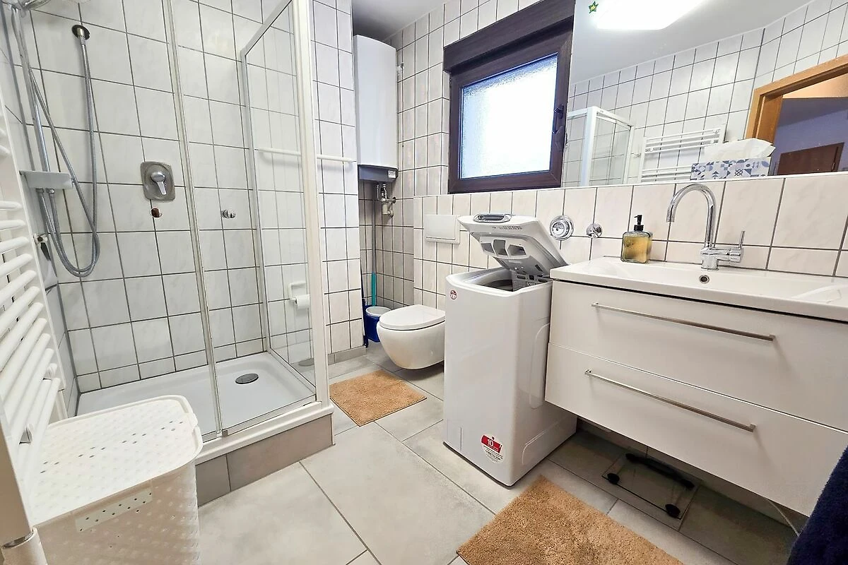 - Das Tageslichtbad bietet eine Dusche, Waschtisch, Toilette, Handtuchtrockner, Waschmaschine und Föhn.