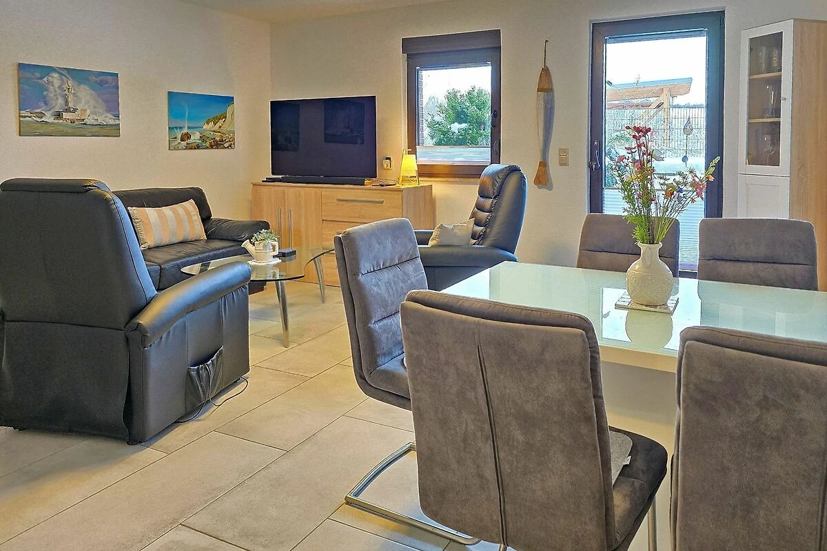 - Im Wohn-Essbereich erwartet Sie ein gemütliches Sofa mit Sesseln, ein grosser Flachbild-TV, Blu-ray-Player, Radio und ein Esstisch mit 5 Stühlen. Des Weiteren gibt ein Schrankbett für die 5. Person.