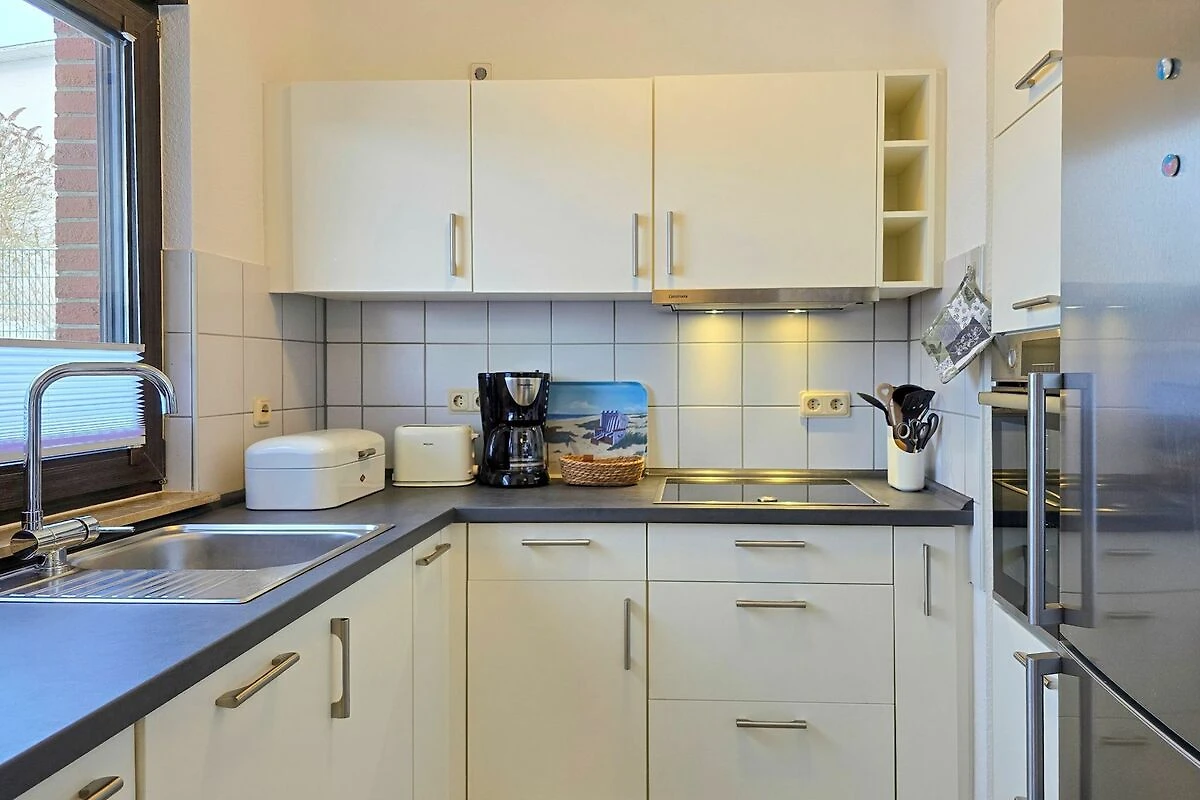 - Die Küche ist offen zum Wohnbereich mit Ceranherd (Induktion), Backofen, Kühlschrank, grossem Tiefkühlschrank, Geschirrspüler, Mikrowelle und verfügt über diverse Küchenutensilien.