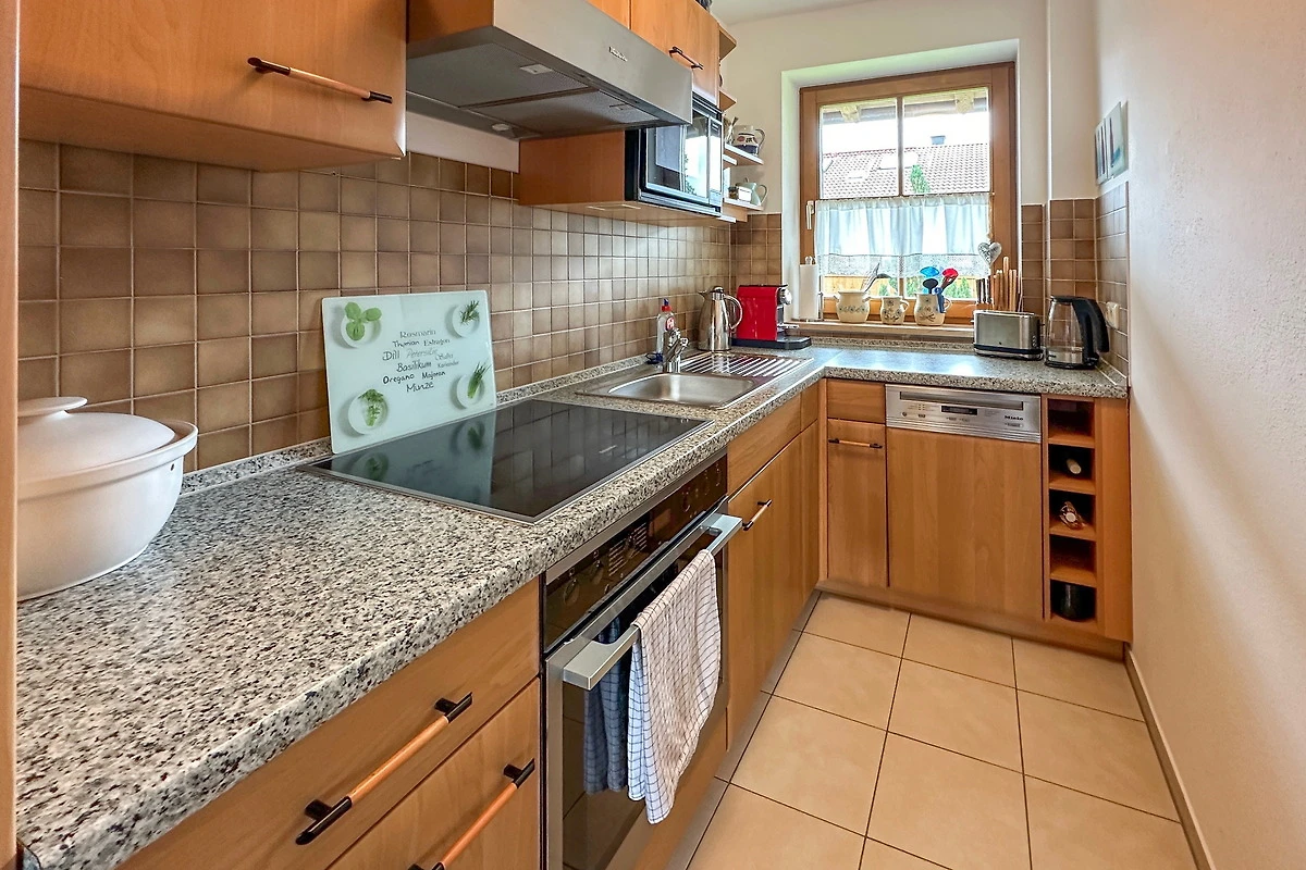 Besonders schön sind die zwei möblierten Balkone, die Ausblicke ins Grüne und auf die Berge bieten. WLAN und Spülmaschine sorgen für Komfort, während die Nähe zum Chiemsee ideale Voraussetzungen für entspannte und aktive Urlaubstage schafft.