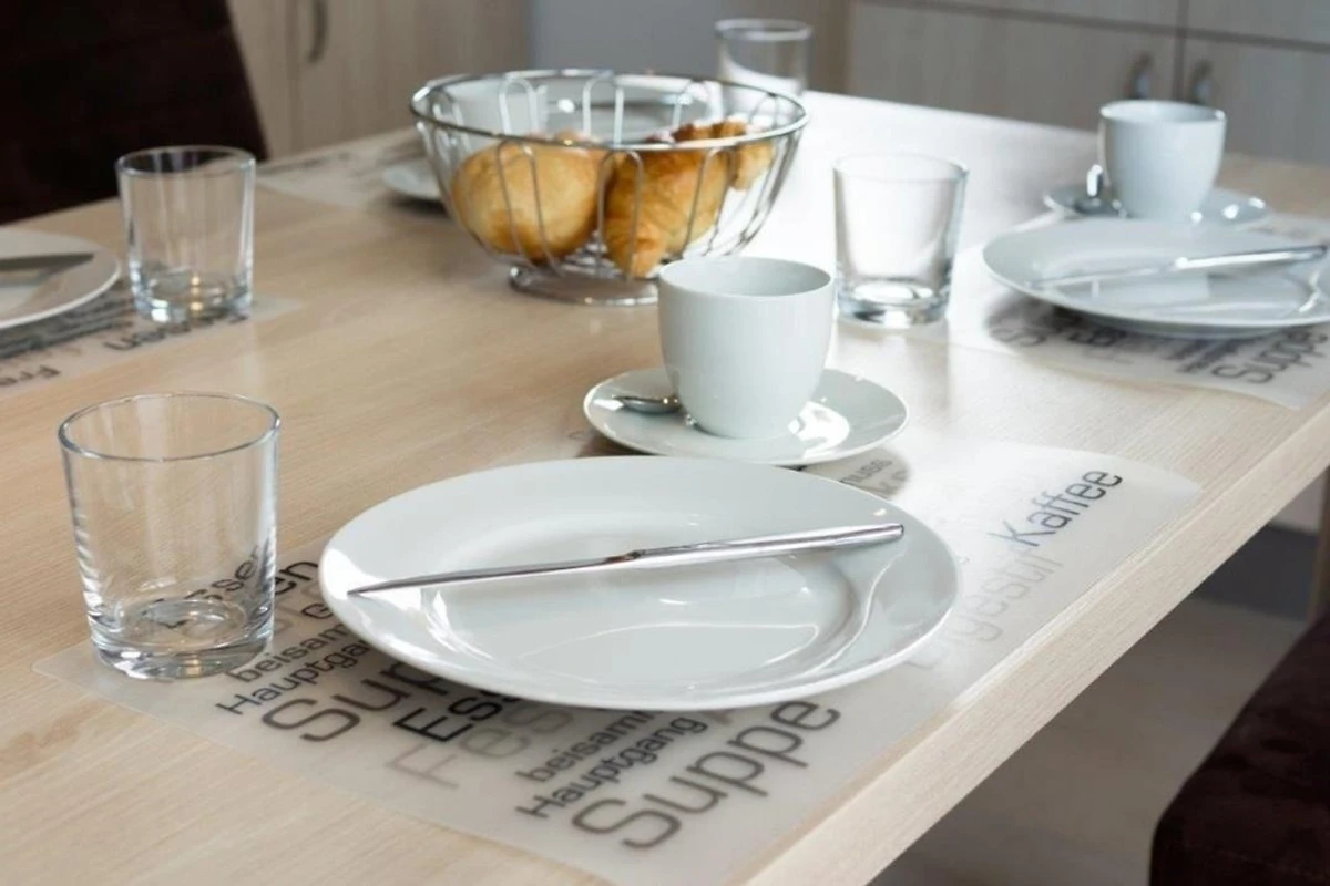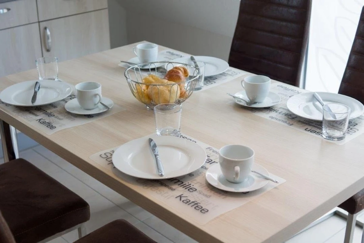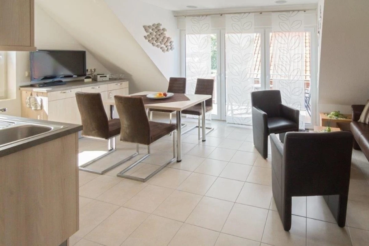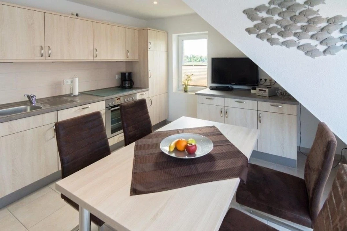 Der helle Wohn‑ und Essbereich bildet das Herzstück der Ferienwohnung und sorgt dank Fussbodenheizung zu jeder Jahreszeit für ein angenehmes Raumklima. Die moderne Einrichtung lädt nach einem Tag an der frischen Nordseeluft zum Entspannen ein. Grosse Fenster sorgen für viel Tageslicht, während elektrische Jalousien eine vollständige Verdunkelung ermöglichen. Die hochwertige Küche ist vollständig ausgestattet und lässt keine Wünsche offen. Neben Geschirrspüler, Backofen, Cerankochfeld, Kühlschrank mit Gefrierfach und Mikrowelle stehen auch Kaffeemaschine, Senseo, Wasserkocher, Toaster sowie weitere Küchengeräte zur Verfügung, sodass die Selbstversorgung im Urlaub ganz unkompliziert möglich ist.