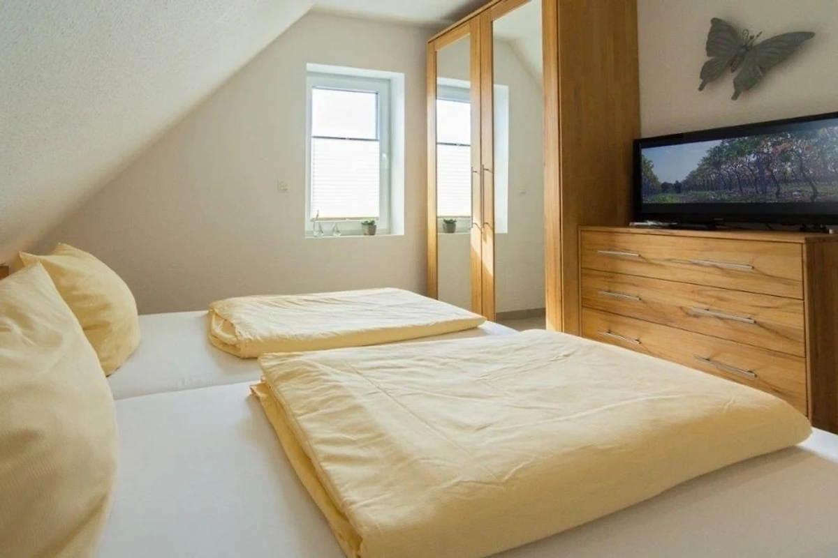 Die Ferienwohnung Strandlilie verfügt über zwei separate Schlafzimmer, die erholsamen Schlaf für alle Gäste bieten. Ein Schlafzimmer ist mit einem komfortablen Doppelbett ausgestattet, das zweite mit zwei gemütlichen Einzelbetten und eignet sich ideal für Kinder oder weitere Mitreisende. Elektrische Jalousien in den Schlafräumen sorgen für Ruhe und Dunkelheit in der Nacht. Das moderne Badezimmer ist hochwertig ausgestattet und verfügt über eine bodengleiche Dusche, Fussbodenheizung, Handtuchtrockner, Föhn sowie weitere komfortable Details, die den Aufenthalt besonders angenehm machen.