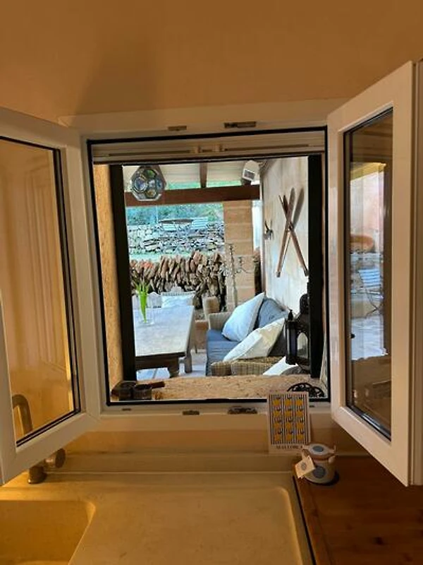 Mit einem großen, antiken Holztisch (ca. 2 m), Bank und Stühlen ist sie ideal für gemeinsame Mahlzeiten. Für kühlere Tage stehen Heizstrahler sowie ein herunterfahrbares Wind- und Regenschutzrollo zur Verfügung.