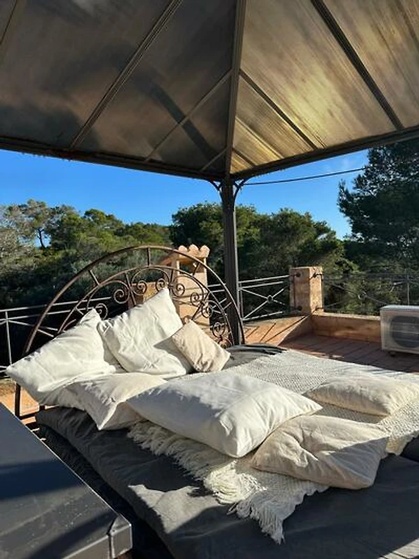 Ein echtes Highlight: ganztägige Sonne, Blick durch die Bäume auf das Meer, ein großes Daybed unter einem Pavillon, vier Sonnenliegen und mehrere Sitzgelegenheiten. Abends – bei klarem Himmel – lassen sich hier wunderbar die Sterne beobachten.