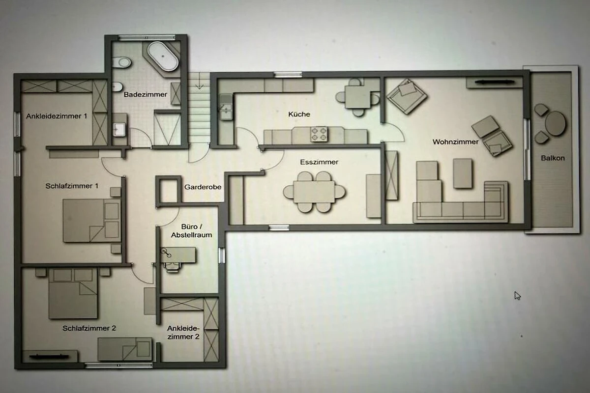 In der 1. Etage: (Wohnzimmer(, Bibliothek, TV, Sitzecke, DVD-Spieler, Fliegenfenster), Küche(, , , Kochnische, Esstisch, Kochplatte, Wasserkocher, Toaster, Kaffeemaschine, Backofen, Mikrowelle, Spülmaschine, Kühlschrank, Tiefkühlschrank, Fliegenfenster, ), Schlafzimmer(, , Doppelbett king size, TV), Schlafzimmer(, , Doppelbett, TV), Badezimmer(, , Toilette, Badewanne, Dusche, Waschbecken, Bidet, Föhn), Abstellraum(, , , Bügelbrett, Bügeleisen, Trockenschrank))