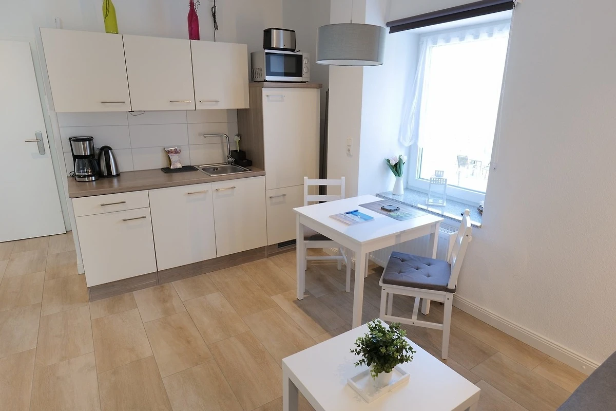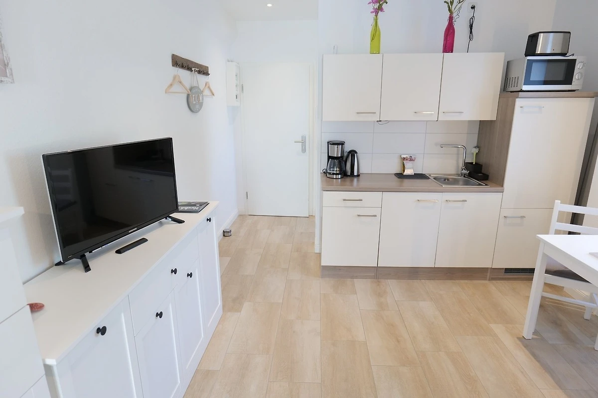 - Wohnzimmer mit offener Küche und Essbereich, Sofa (ausziehbar als Aufbettung für eine 3. Person), Flat-TV, Essbereich für 2 Personen