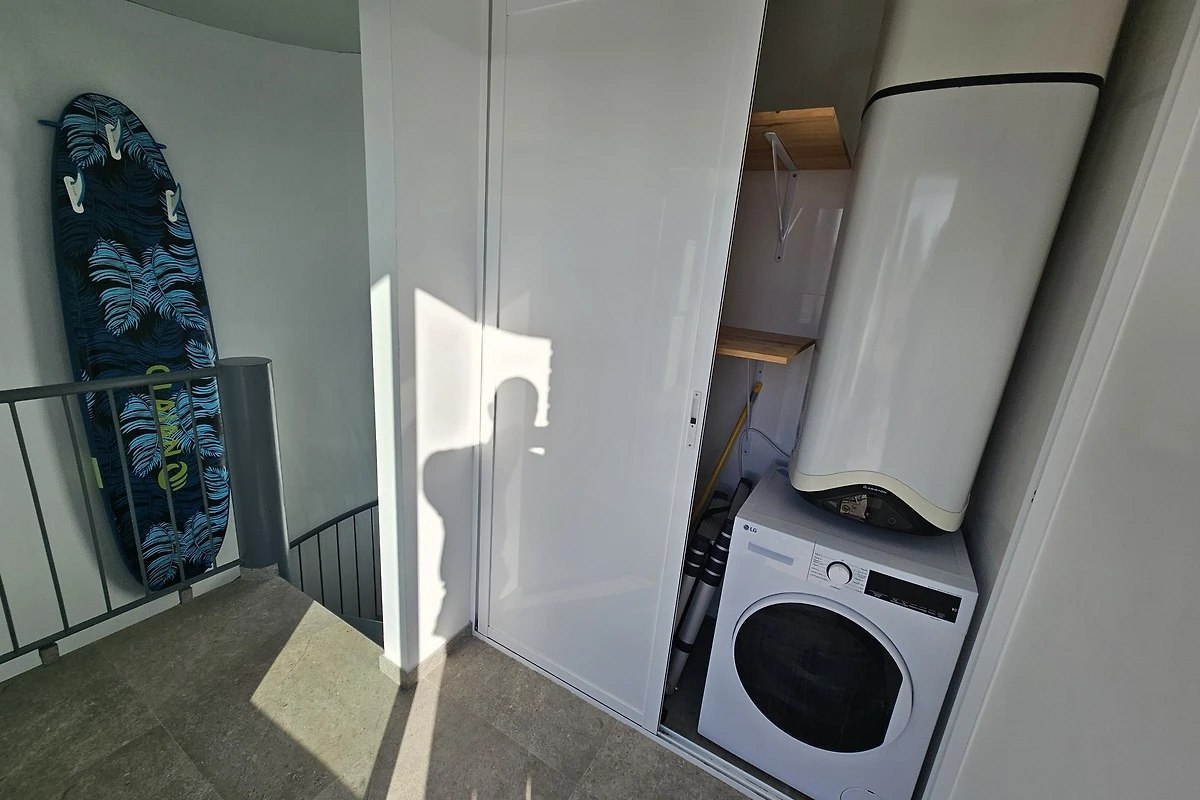 Die voll ausgestattete Küchenzeile lässt keine Wünsche offen: Hier finden Sie einen Geschirrspüler, eine Mikrowelle, einen Wasserkocher und eine Kaffeemaschine. Für Ihren Komfort stehen Bettwäsche, Waschmaschine, Trockner, Bügeleisen und Haartrockner bereit. Die Klimaanlage sorgt auch an warmen Tagen für angenehme Temperaturen. Abends können Sie gemeinsam auf dem Sofa entspannen und dabei das TV-Programm genießen oder mit kostenlosem WLAN Ihre Urlaubserlebnisse teilen.