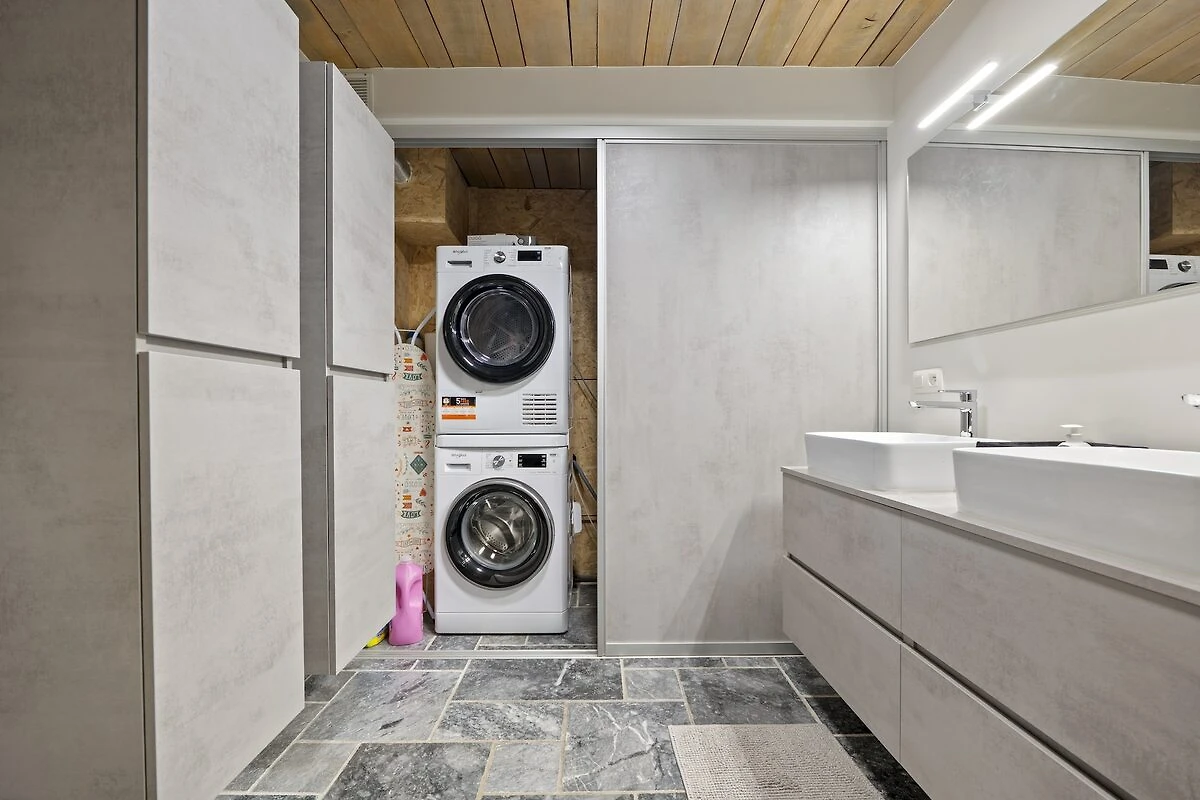 In der 1. Etage: (Schlafzimmer(Doppelbett, Heizung(Fußbodenheizung), Klimaanlage), Badezimmer(Trockner, Dusche(ebenerdige Dusche), Waschbecken, Waschbecken, Waschmaschine), Badezimmer(Badewanne, Dusche(ebenerdige Dusche), Waschbecken, Waschbecken, Toilette), Toilette(Toilette))