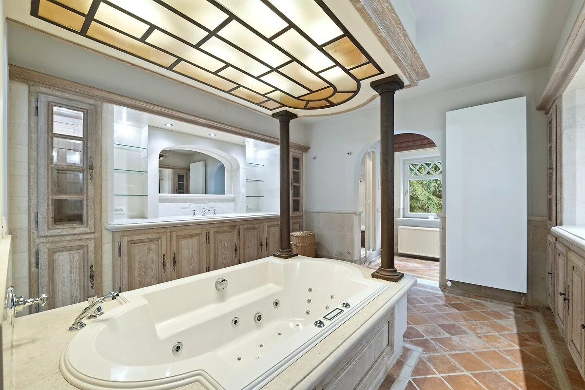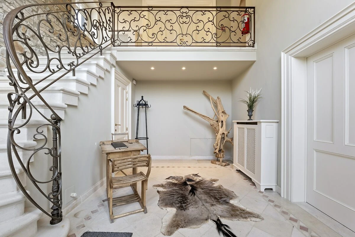 In der 1. Etage: (Schlafzimmer(Doppelbett(Boxspring, Doppelbettdecke, Doppelspannbetttuch, 180 x 200 cm)), Schlafzimmer(Etagenbett(Bettdecke, Spannbetttuch, 90 x 200 cm)), Schlafzimmer(Doppelbett(Boxspring, Doppelbettdecke, Doppelspannbetttuch, 180 x 200 cm)), Schlafzimmer(2x Einzelbett(Bettdecke, Spannbetttuch, 90 x 200 cm), Doppelbett(Boxspring, Doppelbettdecke, Doppelspannbetttuch, 180 x 200 cm)), Schlafzimmer mit Badezimmer(Doppelbett(Boxspring, Doppelbettdecke, Doppelspannbetttuch, 180 x 200 cm), Dusche, Waschbecken, Toilette), Durchgangszimmer(Espressomaschine), Badezimmer(Whirlwanne, 2x Waschbecken), Badezimmer(Dusche, Waschbecken, Toilette), Toilette(Toilette), Flur(Doppelschlafcouch(Doppelbettdecke, Doppelspannbetttuch), TV))