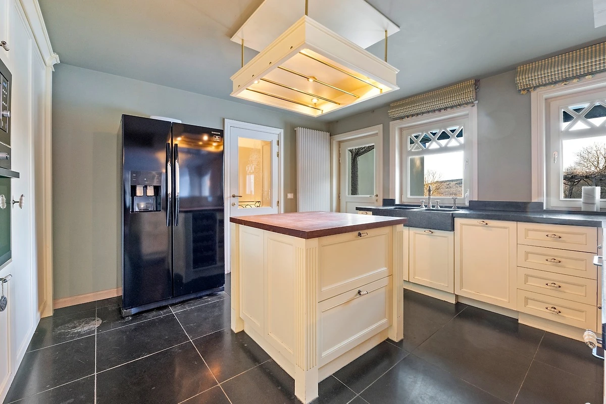 Parterre: (Eingang, Eingangshalle, Aufenthaltsraum(TV, Esstisch(4 Personen), Dekokamin, Sitzecke(14 Personen)), Esszimmer(Esstisch(14 Personen)), Küche(Bar, Wasserkocher, Toaster, Kochherd(6 Kochplatten, Induktion), Dunstabzugshaube, Backofen, Grill, Mikrowelle, Spülmaschine, Kühlschrank, Tiefkühlschrank, Mixer), Küche(Spülmaschine), Toilette(Toilette), Bibliothek(Sitzecke), Wirtschaftsraum(Bügelbrett, Bügeleisen), Garage(über gemeinsamen Eingang), Fahrradabstellraum)