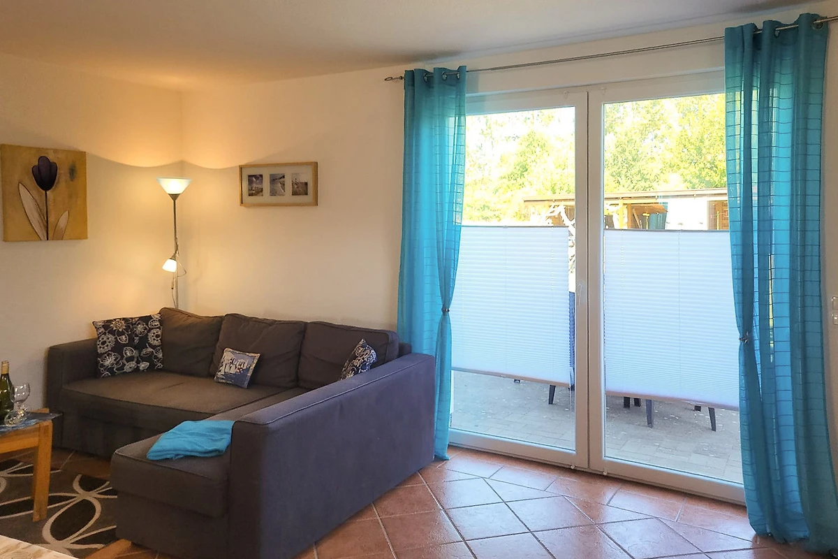Von hier aus gelangen Sie direkt auf die möblierte Terrasse mit Gartenanteil – perfekt für entspannte Stunden im Freien.
