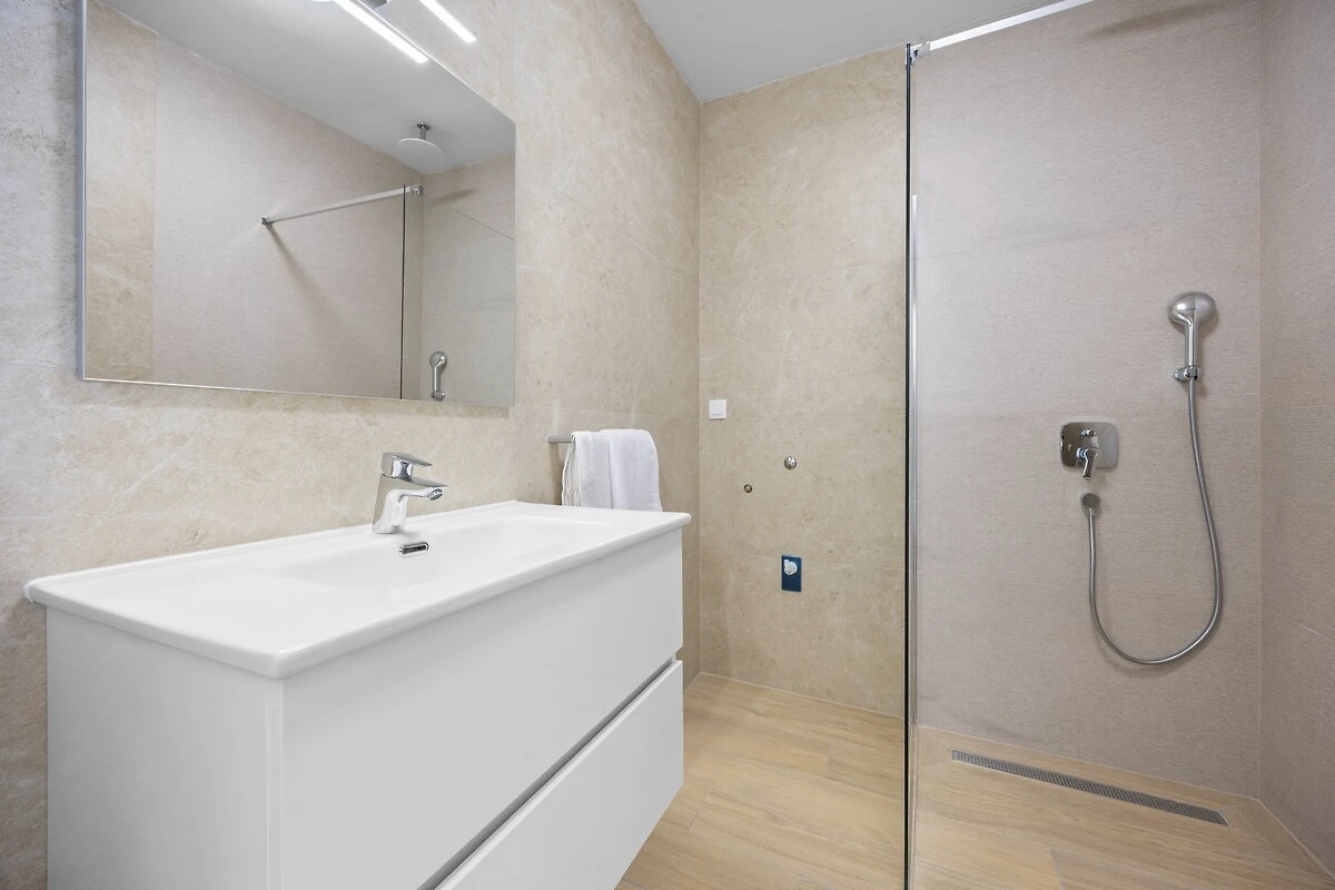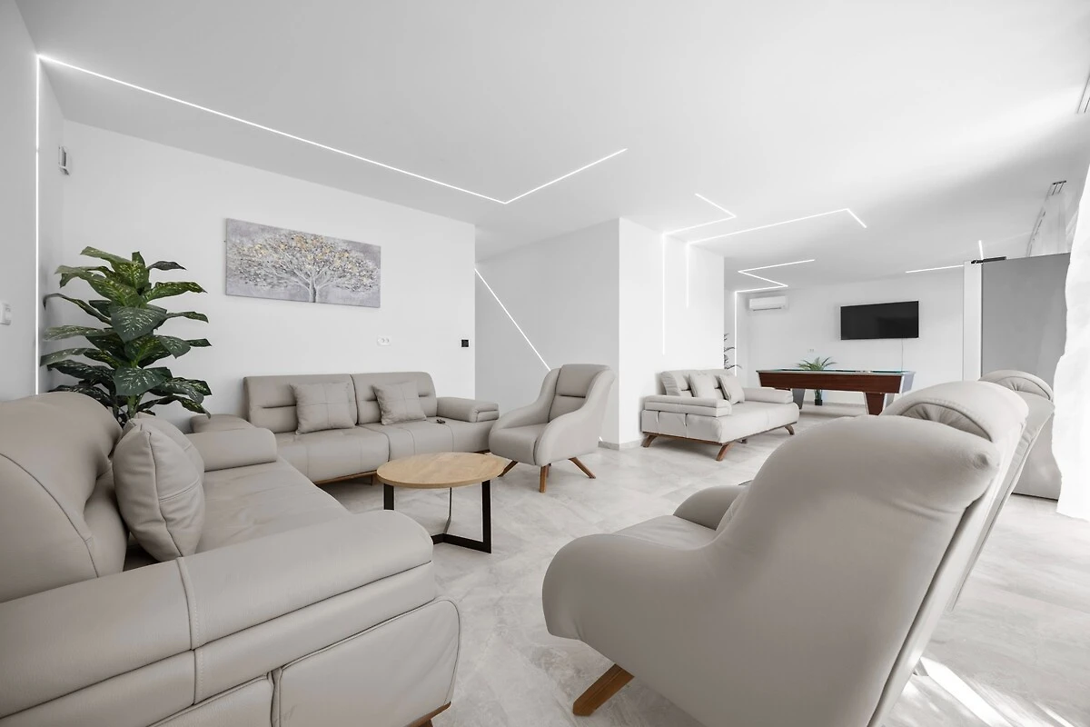 Nur 500 Meter vom Meer entfernt, beeindruckt die Villa Residence durch ihr modernes Design, luxuriöse Ausstattung und hohen Wohnkomfort. Von den Balkonen aus genießt man einen herrlichen Meerblick, während sorgfältig ausgewählte Details, hochwertige Materialien und ein zeitgemäßes Interieur eine Atmosphäre von Eleganz und Entspannung schaffen.