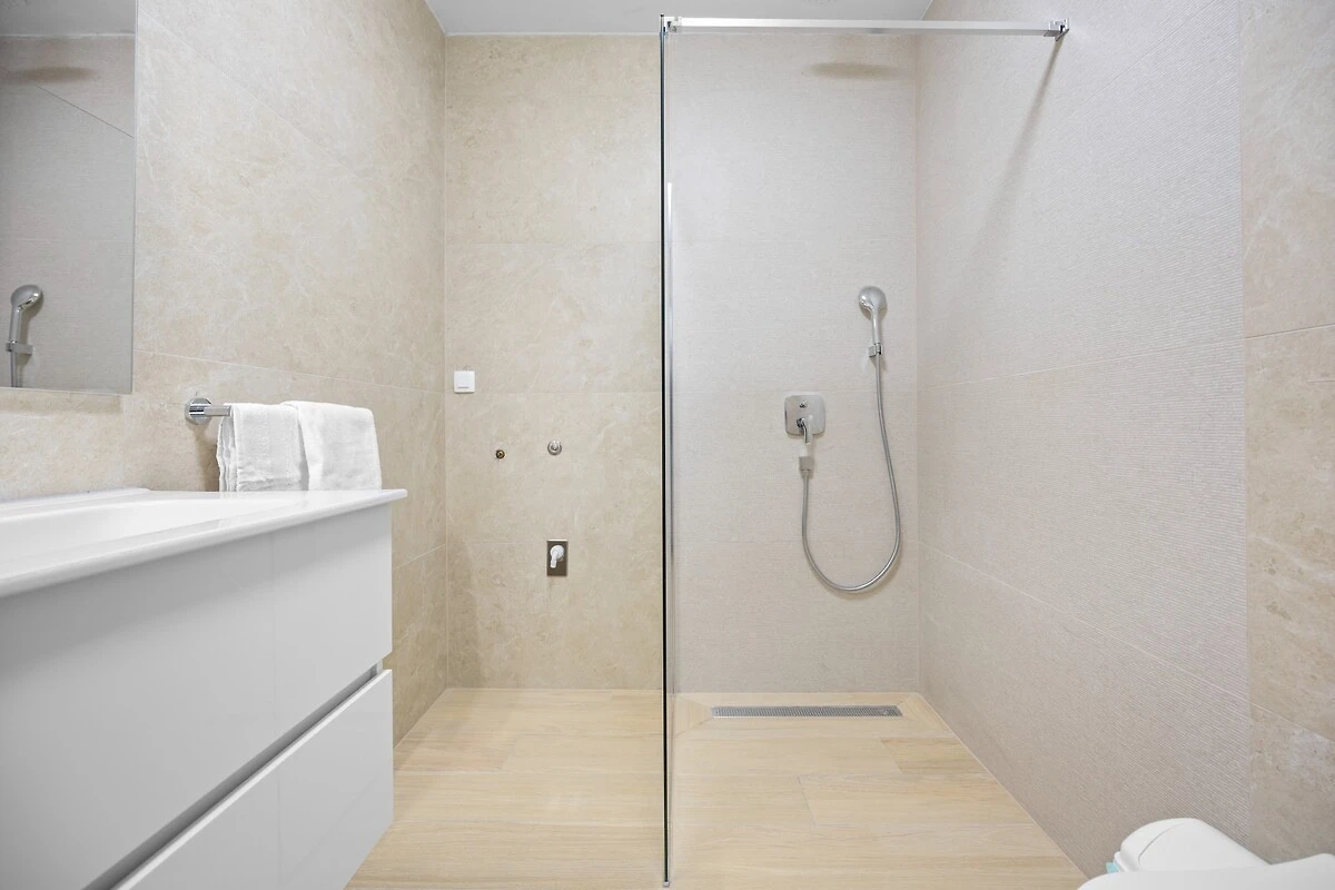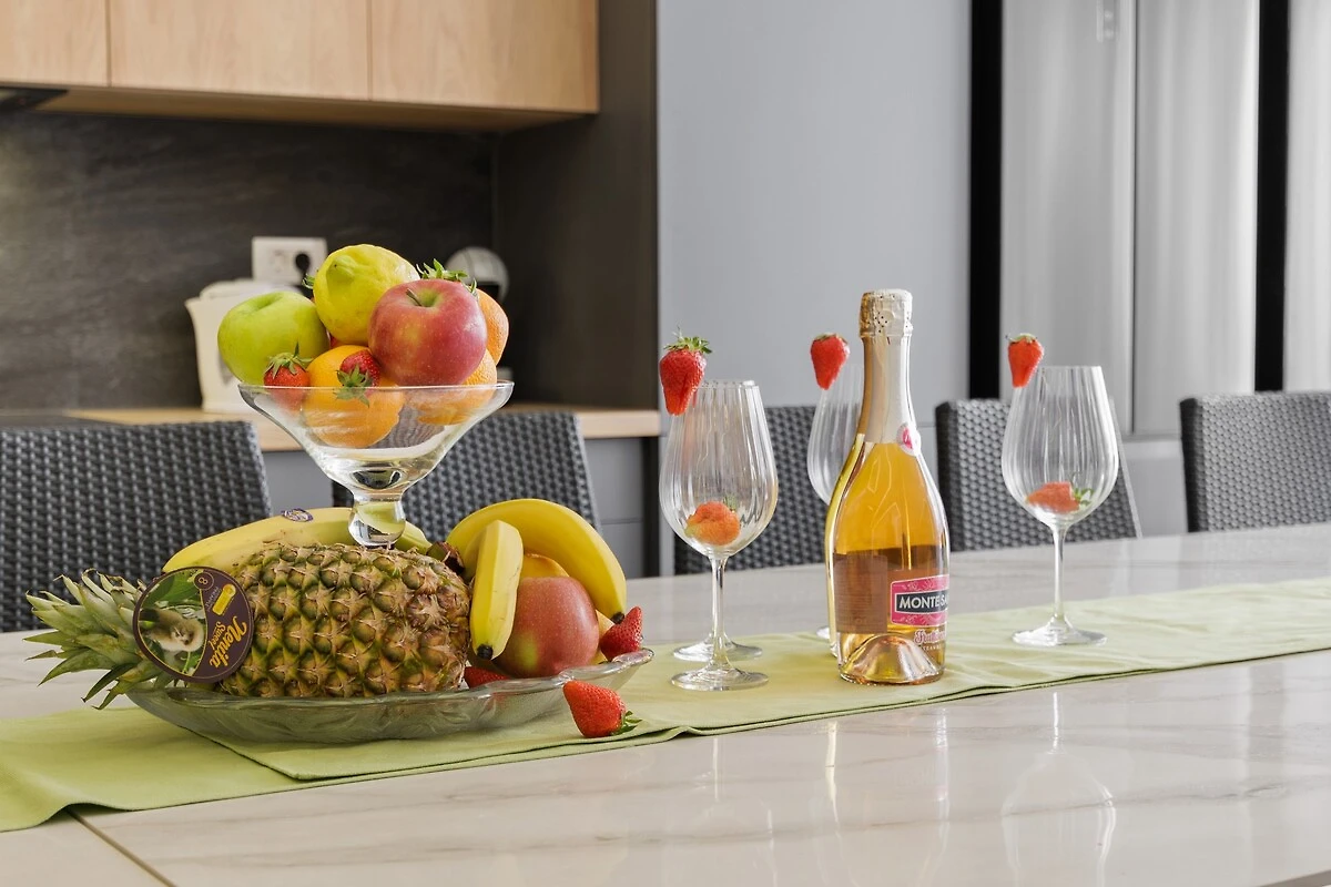 Im Erdgeschoss befinden sich ein großzügiges Wohnzimmer mit bequemen Sitzmöbeln, eine voll ausgestattete Küche sowie ein großer Essbereich mit einem langen Tisch – perfekt für gemeinsame Mahlzeiten und gesellige Abende. In diesem Bereich gibt es außerdem zwei Schlafzimmer mit privaten Badezimmern sowie ein zusätzliches Badezimmer im Flur.