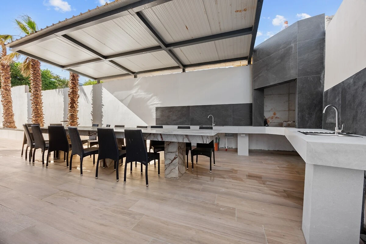 Ein besonderes Highlight der Villa ist der große Außenpool (78 m²) mit integriertem Jacuzzi, perfekt zum Entspannen und Sonnenbaden. Im Garten befinden sich große Esstische, eine voll ausgestattete Sommerküche und ein Grillplatz – ideal für Sommerabende und gemütliche Mahlzeiten im Freien.
