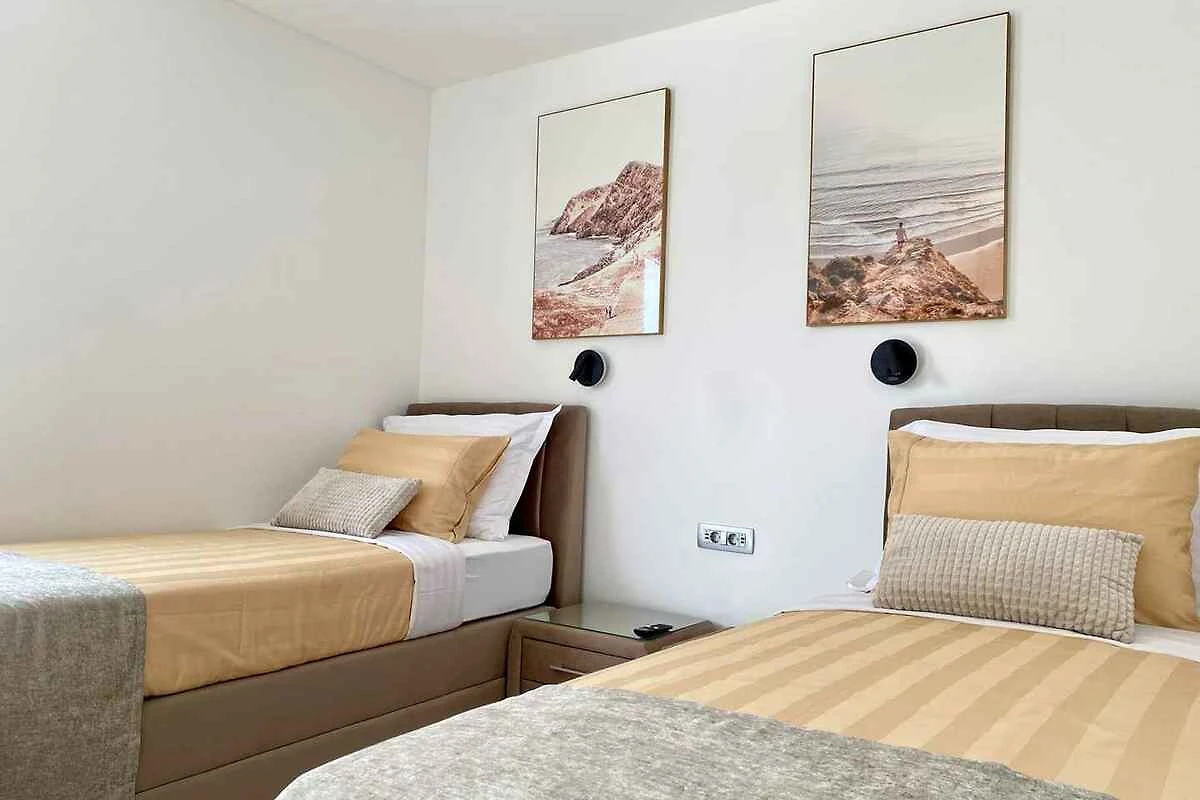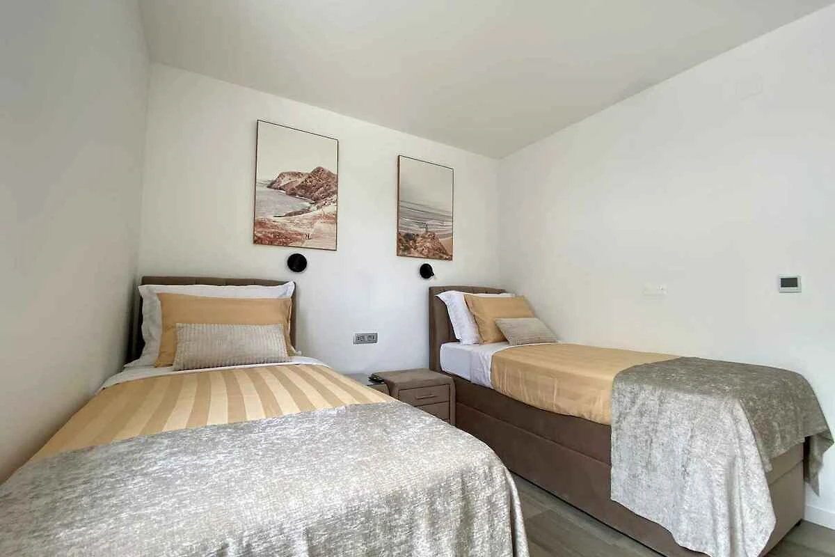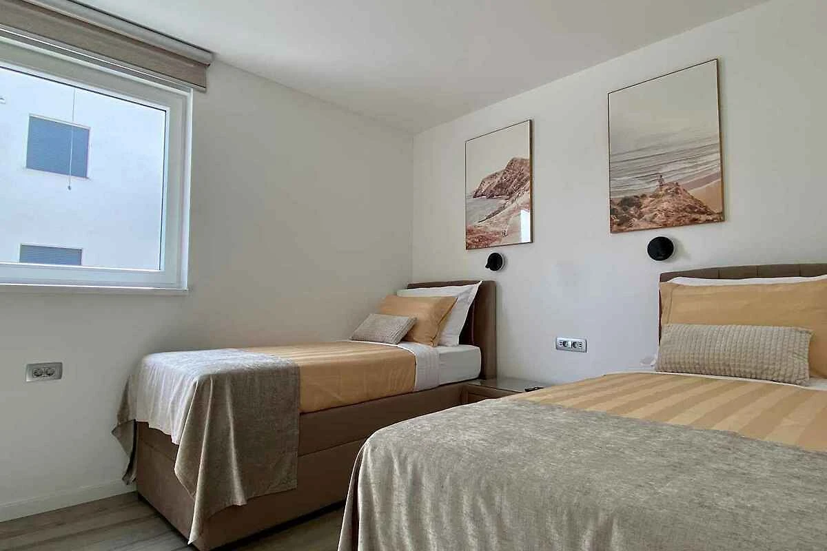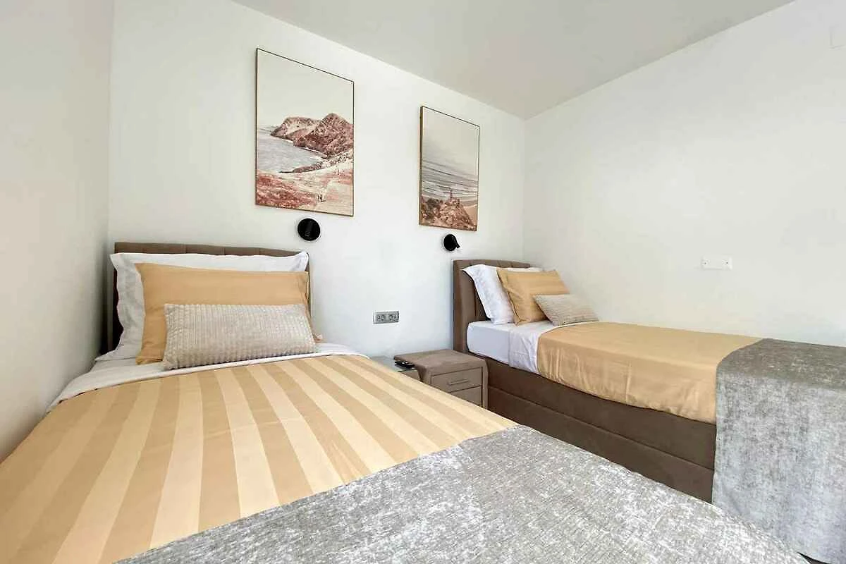 und führt über eine Innentreppe direkt in den Flur. Wohnzimmer mit TV, Zugang zum Balkon und Ein Smart-TV mit Netflix und YouTube steht Ihnen ebenfalls zur Verfügung. Schlafzimmer mit 2 Einzelbetten und TV. Schlafzimmer mit 1 Doppelbett (Queensize), TV mit Streamingdiensten (z.B. Netflix) und Klimaanlage. Küche mit Gasherd, Backofen, Geschirrspüler, Kühlschrank, Mikrowelle, Kaffeemaschine, Toaster und elektrischem Wasserkocher. Bad mit Dusche und Föhn. Bad mit Waschmaschine, Dusche und WC. Separates WC mit WC.