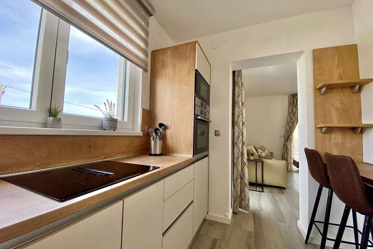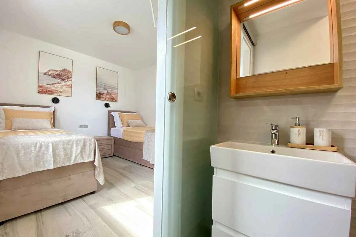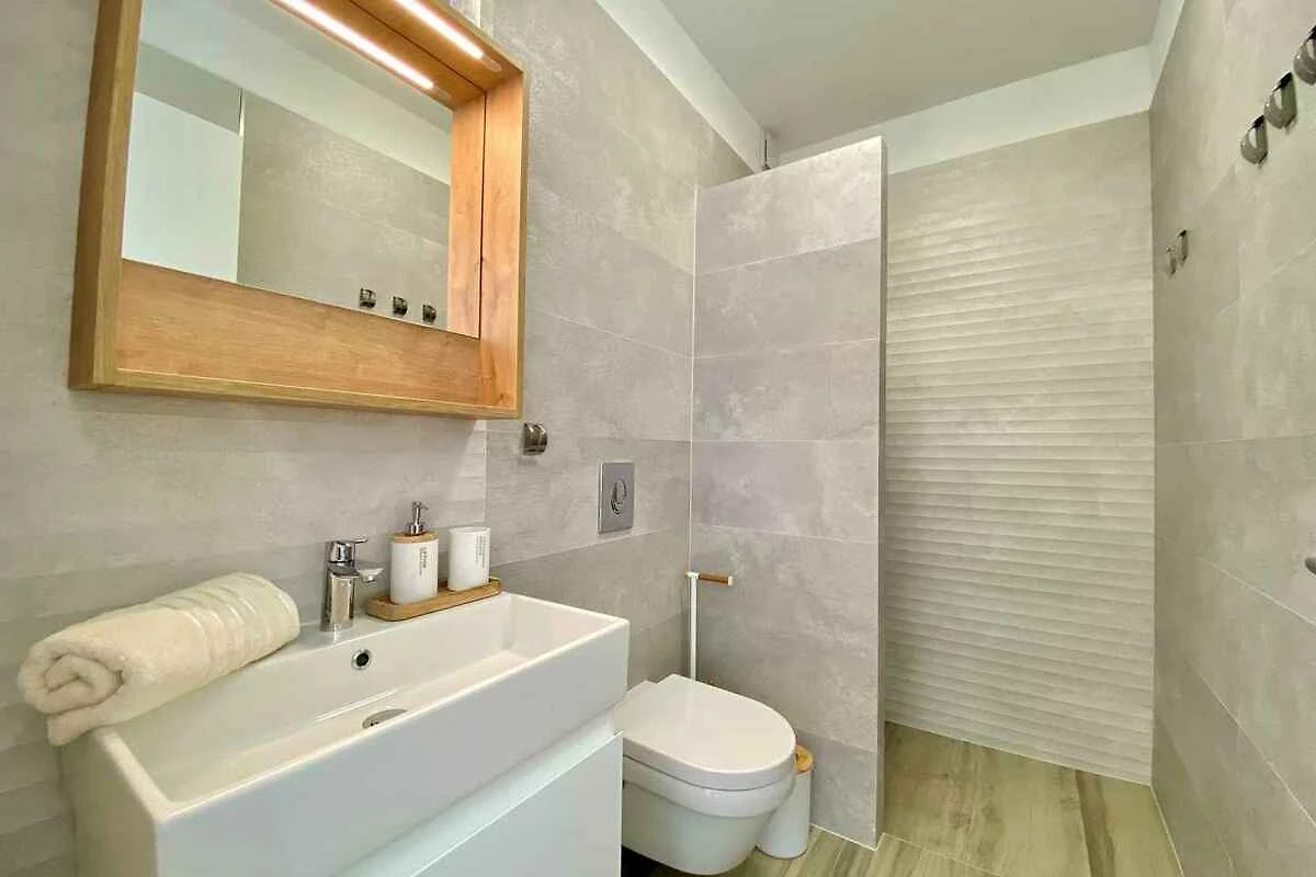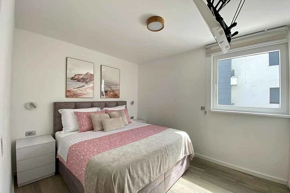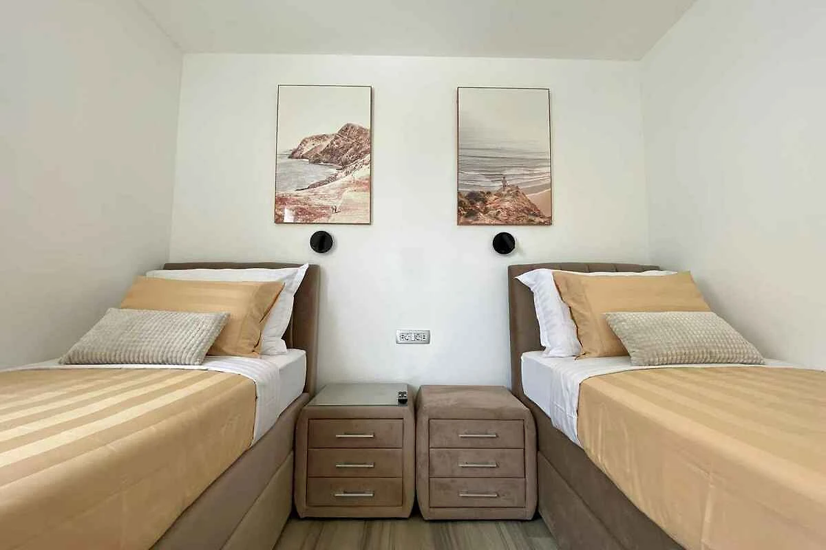 und führt über eine Innentreppe direkt in den Flur. Wohnzimmer mit TV, Zugang zum Balkon und Ein Smart-TV mit Netflix und YouTube steht Ihnen ebenfalls zur Verfügung. Schlafzimmer mit 2 Einzelbetten und TV. Schlafzimmer mit 1 Doppelbett (Queensize), TV mit Streamingdiensten (z.B. Netflix) und Klimaanlage. Küche mit Gasherd, Backofen, Geschirrspüler, Kühlschrank, Mikrowelle, Kaffeemaschine, Toaster und elektrischem Wasserkocher. Bad mit Dusche und Föhn. Bad mit Waschmaschine, Dusche und WC. Separates WC mit WC.