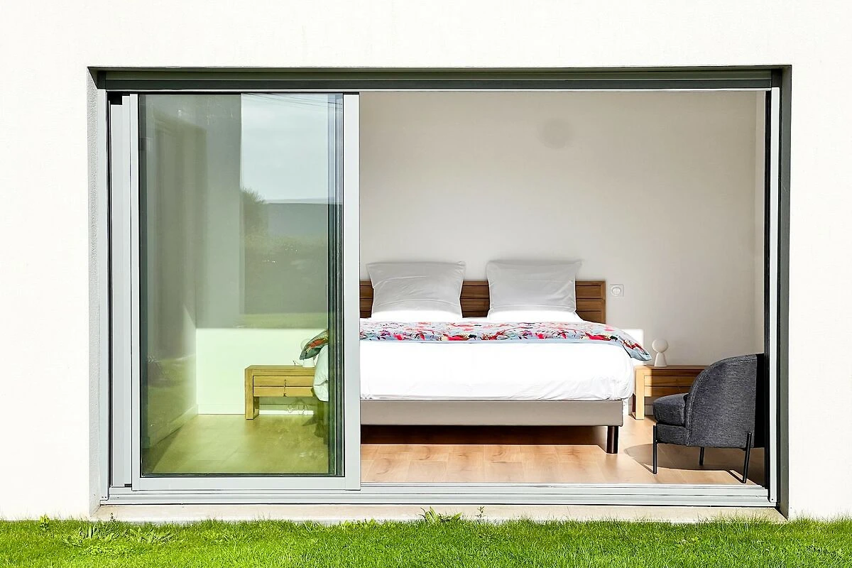 Im Erdgeschoss befindet sich die Master-Suite mit einem 160 x 200 cm großen Bett, großen Fenstern, die direkt in den Garten führen, einem angrenzenden Ankleidezimmer sowie einem Badezimmer mit Badewanne, Dusche und separatem WC.