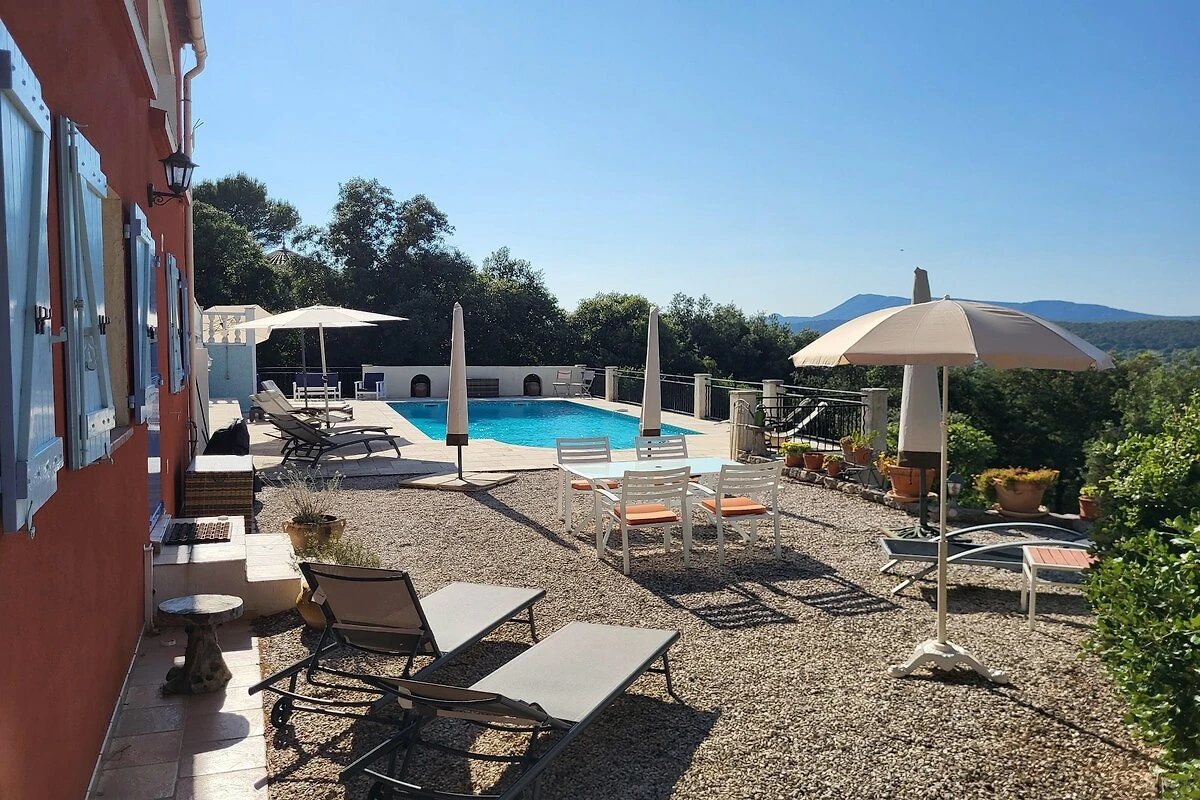 Draußen lädt eine angenehme private Terrasse mit Esstisch, Sonnenliegen und Sonnenschirmen zum Verweilen ein. Von hier aus haben Sie einen herrlichen Blick auf den beheizten Pool, der exklusiv für Sie reserviert ist.