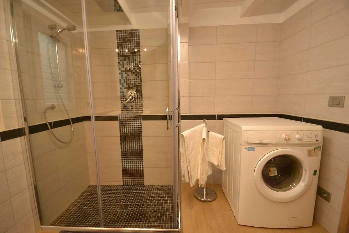 Parterre: (offene Küche(Kochherd, Kaffeemaschine, Backofen, Kühl-/Gefrierkombination), Wohn-/Schlafzimmer(Doppelbett, TV, Esstisch), Badezimmer(Dusche, Waschbecken, Toilette, Bidet, Waschmaschine), Veranda, Holzherd)