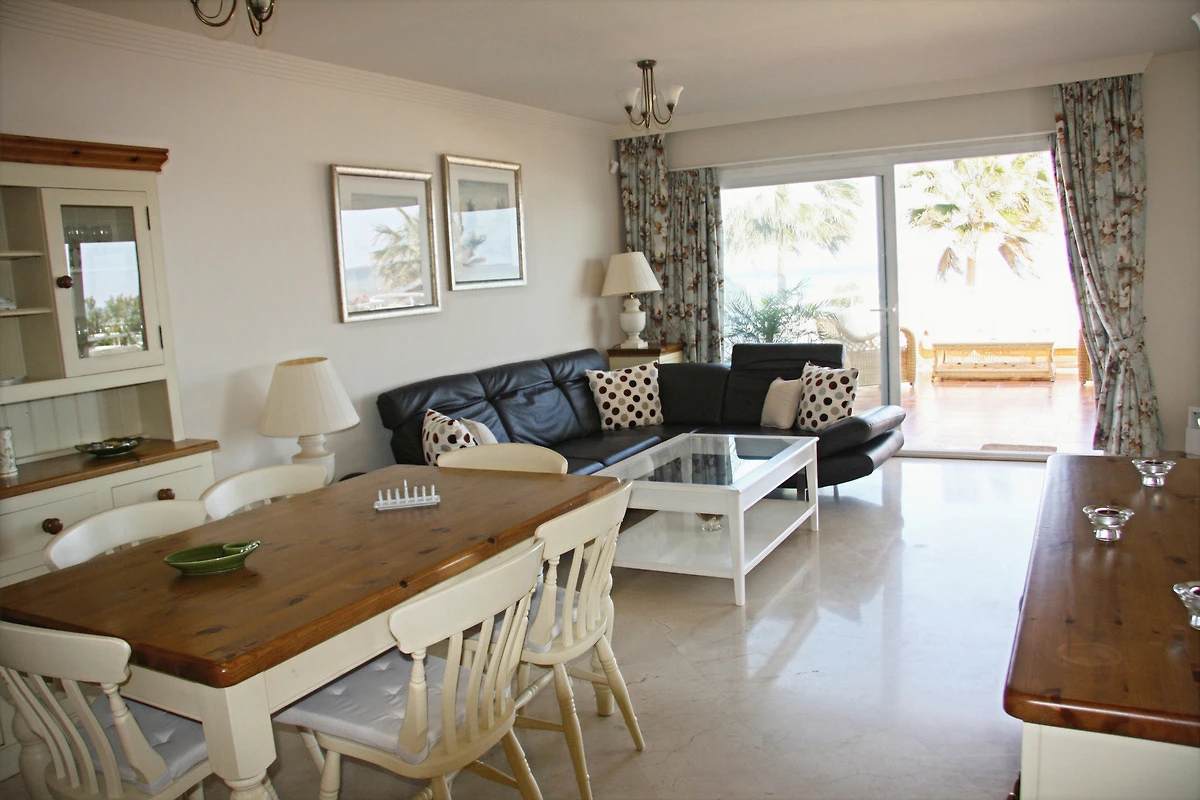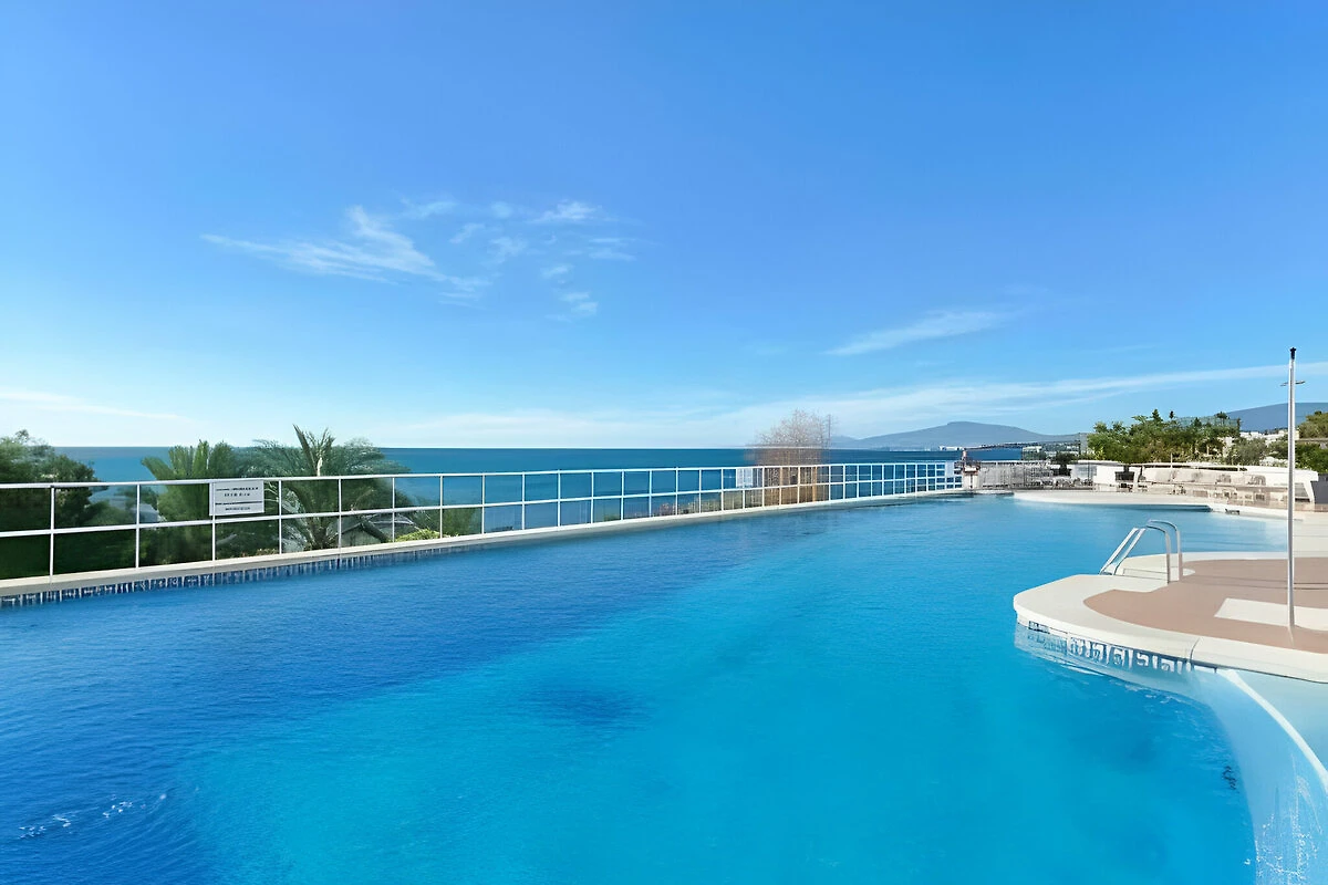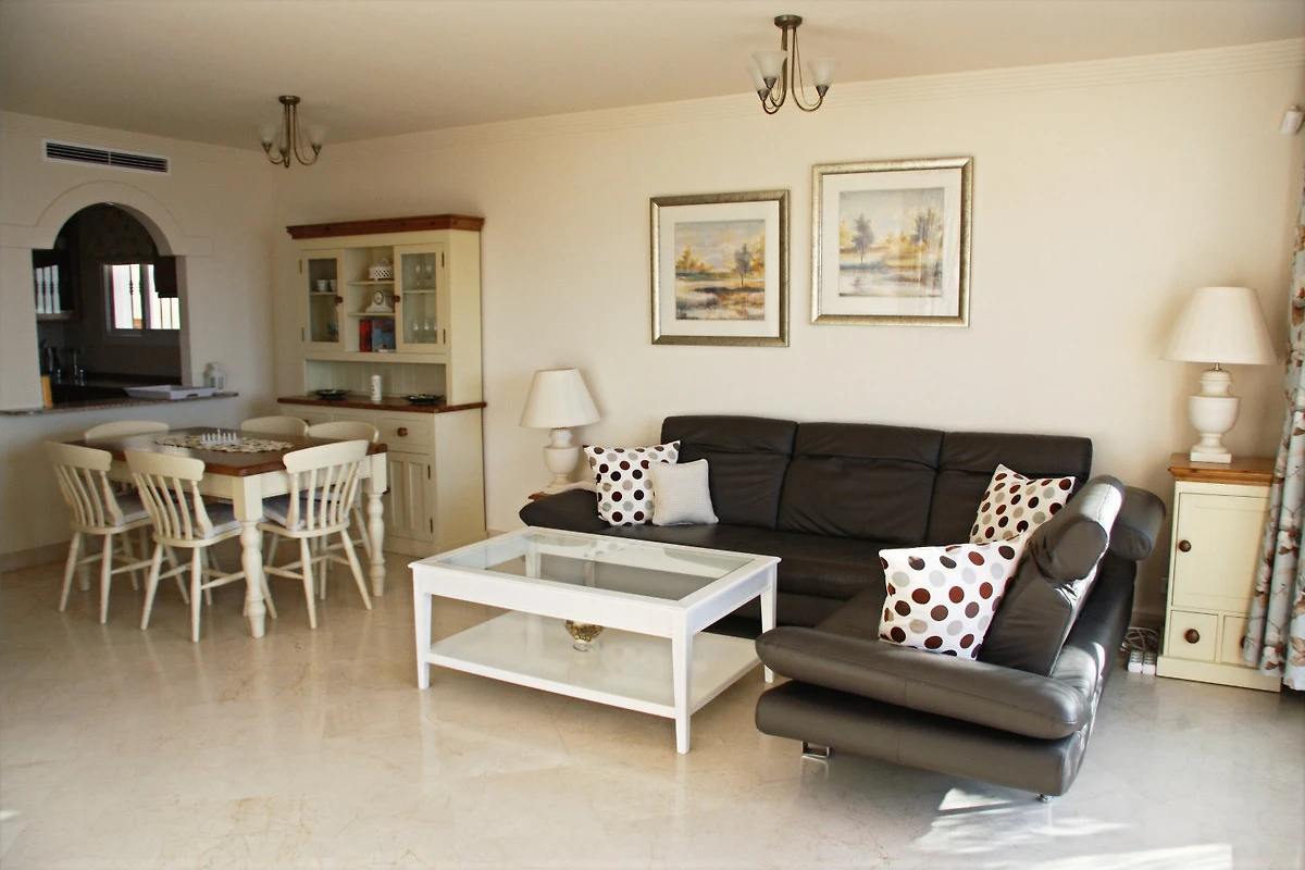 Geräumige Unterkunft: Atemberaubendes, uneingeschränktes 180-Grad-Meerblick-Apartment mit 100 m² Terrasse in Estepona bietet zwei Schlafzimmer und zwei Badezimmer. Das Wohnzimmer verfügt über ein Sofa und einen Essbereich.