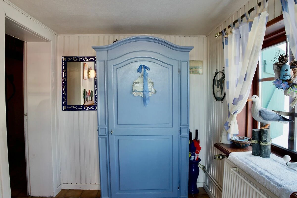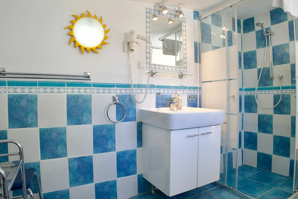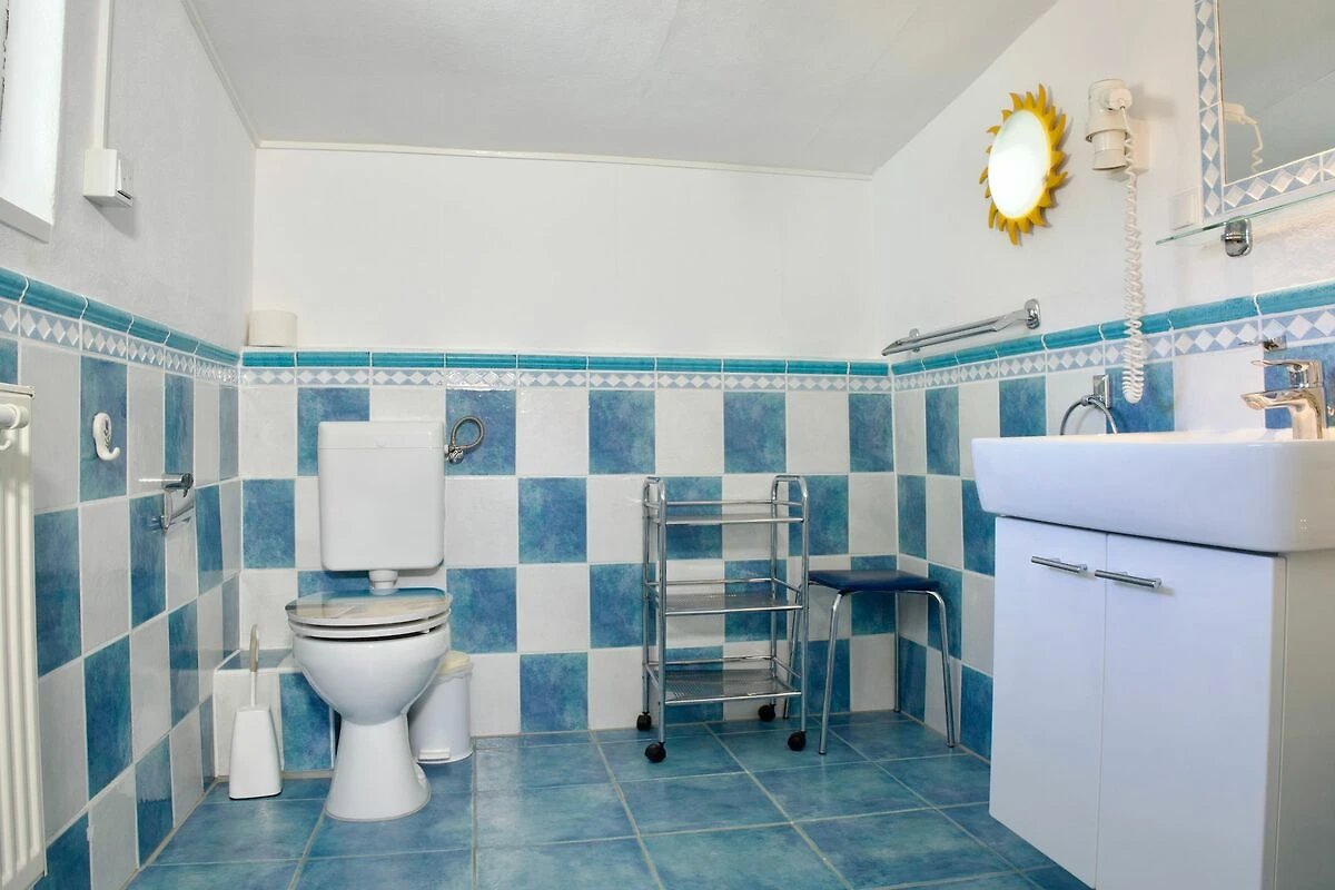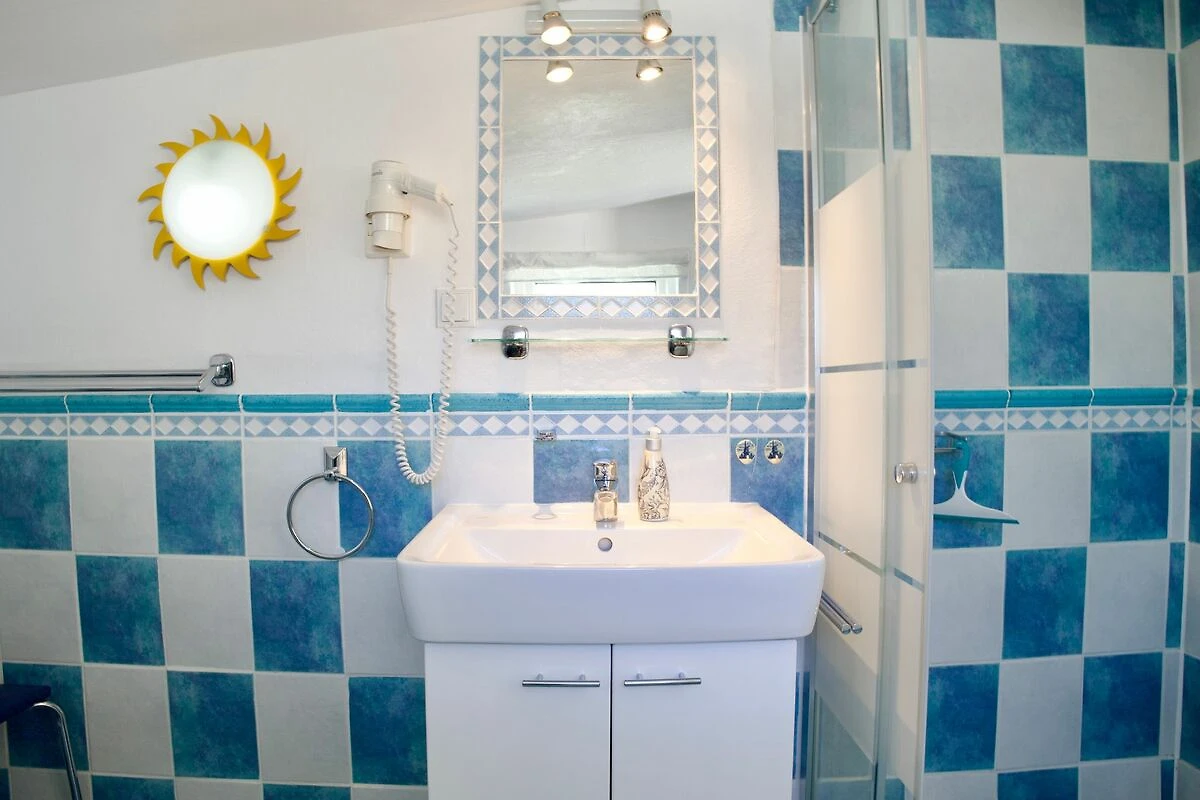 Das Badezimmer ist als helles, maritim gestaltetes Duschbad ausgeführt und ergänzt die Ausstattung des Hauses stimmig.