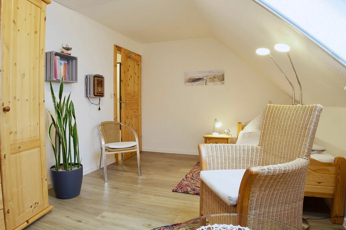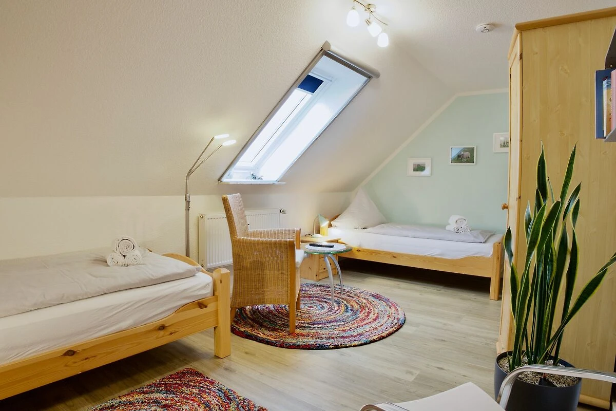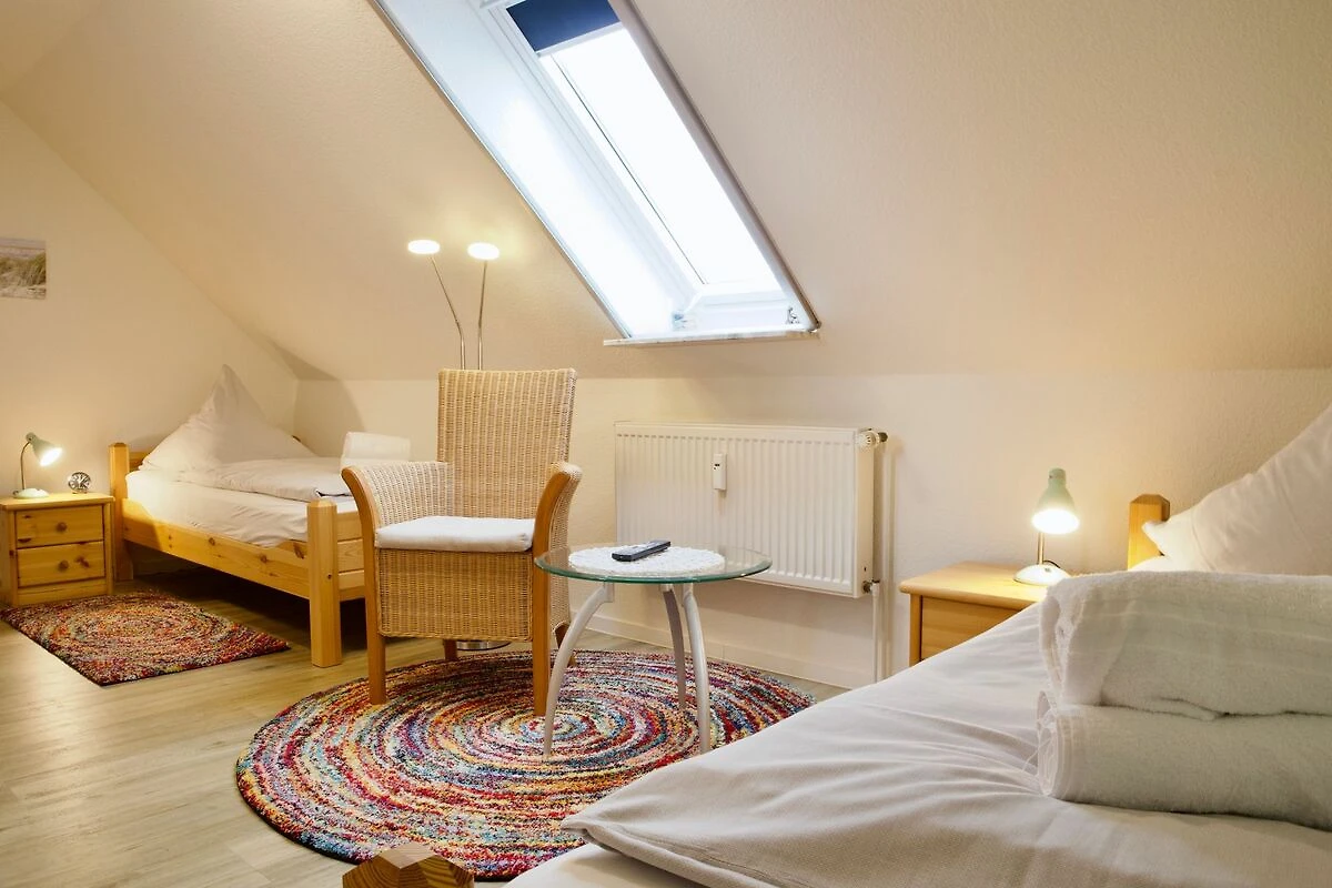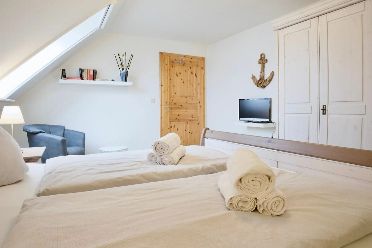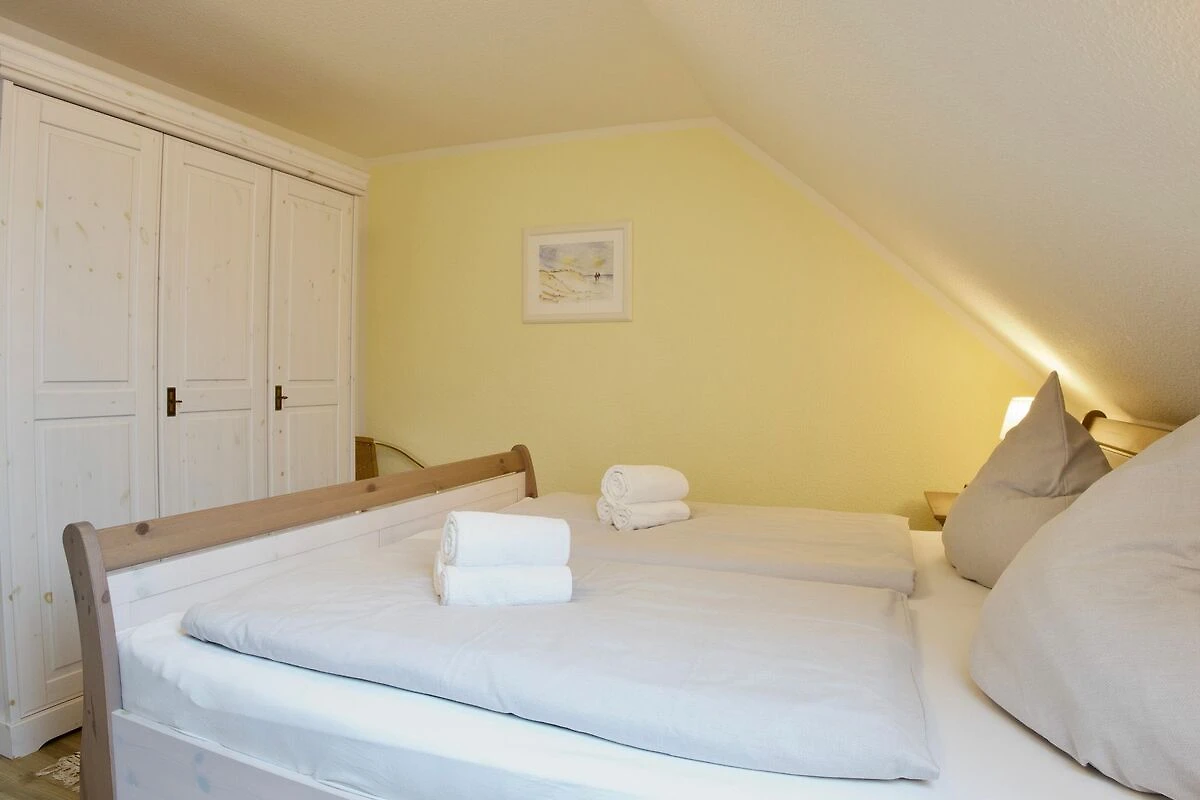 Im Obergeschoss erwarten Sie zwei Schlafzimmer. Eines ist mit einem Doppelbett eingerichtet, das zweite mit zwei Einzelbetten. Beide Räume sind hell und ruhig gehalten und bieten angenehme Rückzugsorte nach einem erlebnisreichen Tag auf der Insel.