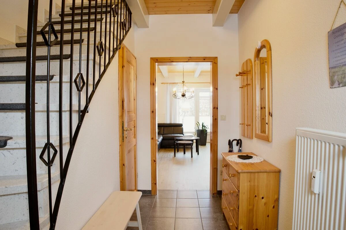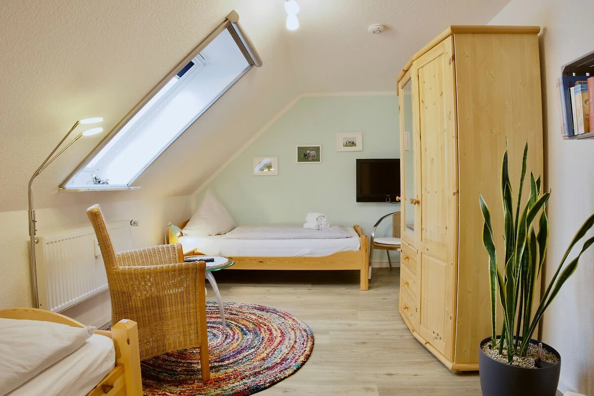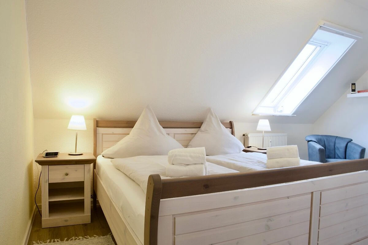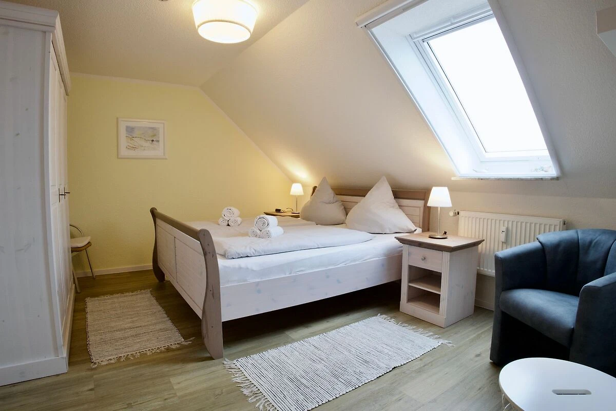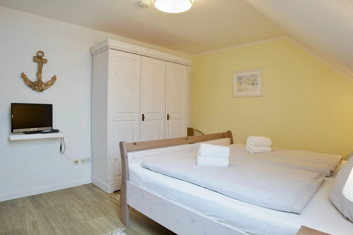 Im Obergeschoss erwarten Sie zwei Schlafzimmer. Eines ist mit einem Doppelbett eingerichtet, das zweite mit zwei Einzelbetten. Beide Räume sind hell und ruhig gehalten und bieten angenehme Rückzugsorte nach einem erlebnisreichen Tag auf der Insel.