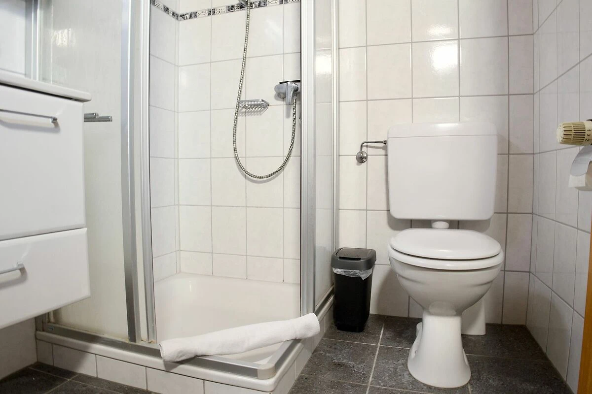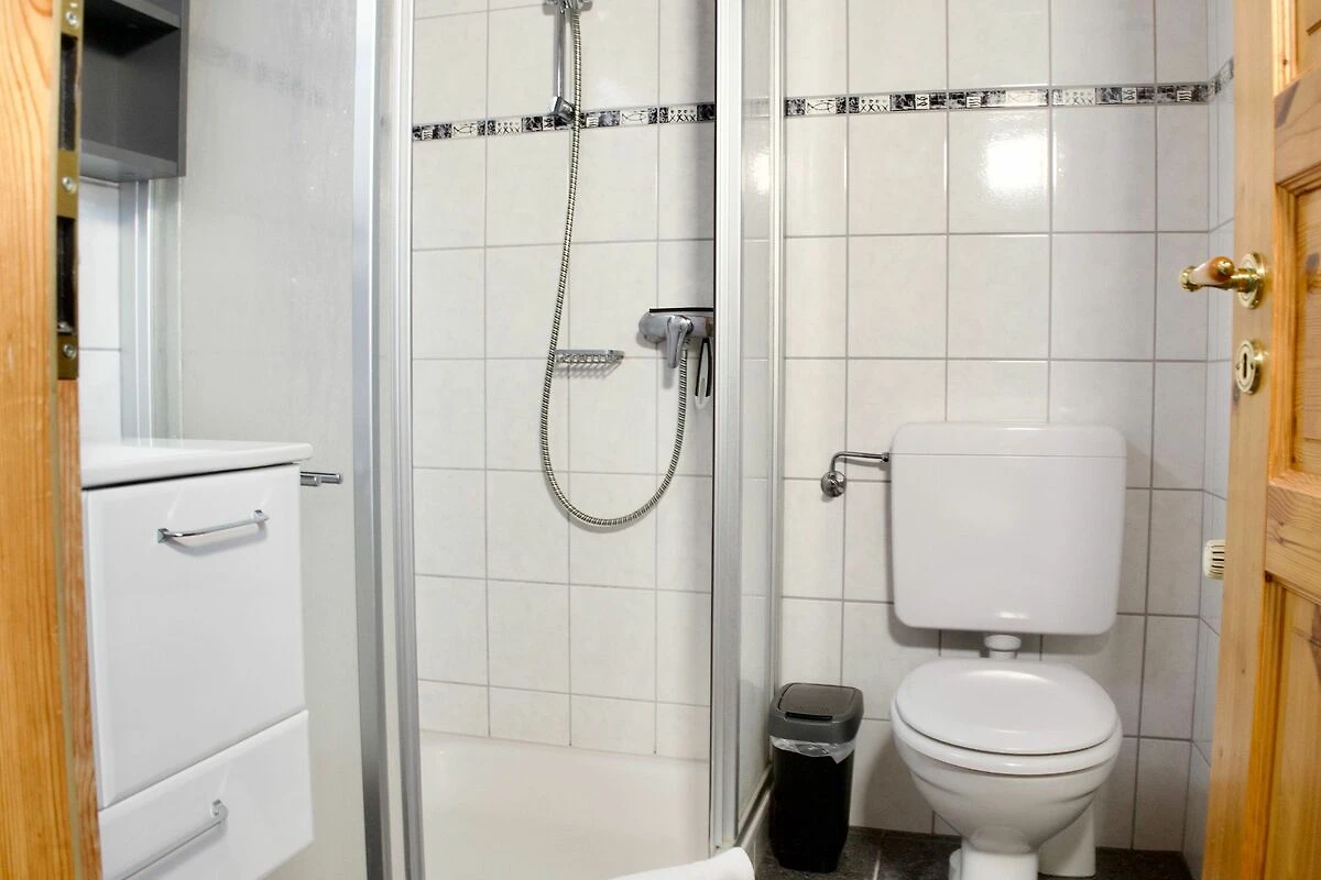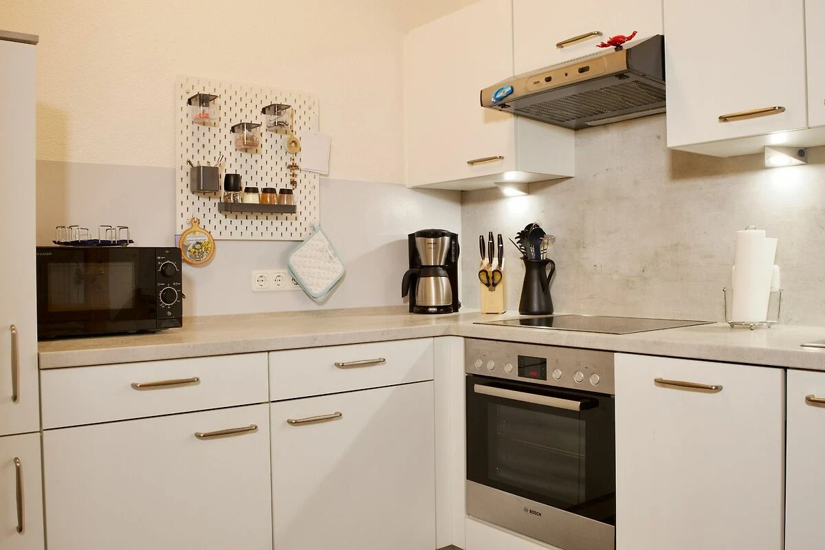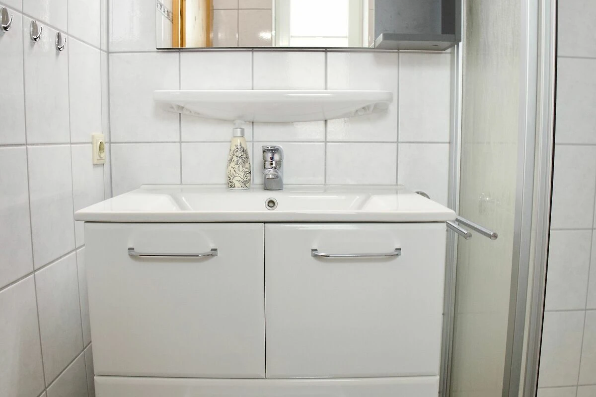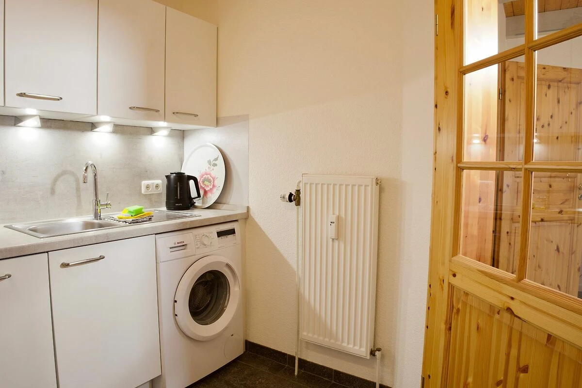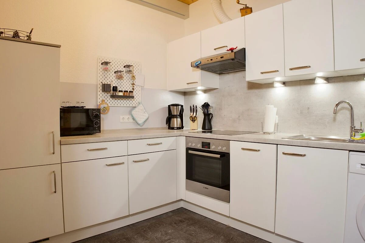 Ebenfalls im Erdgeschoss liegt die separate, vollständig ausgestattete Küche. Neben Kaffeemaschine, Spülmaschine und Gefriermöglichkeit befindet sich hier auch eine Waschmaschine. Das maritim gestaltete Duschbad mit WC rundet das Raumangebot auf dieser Ebene ab.