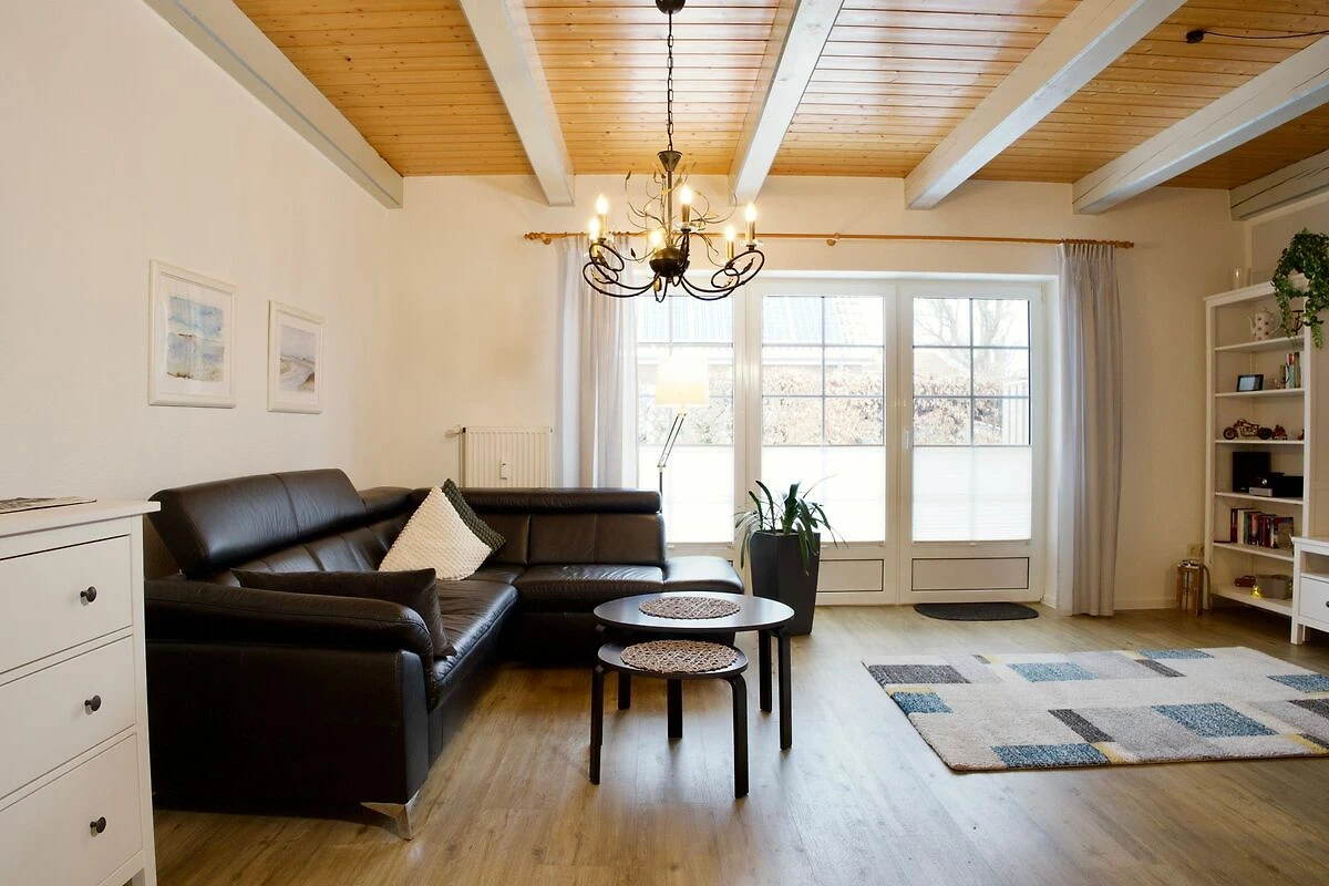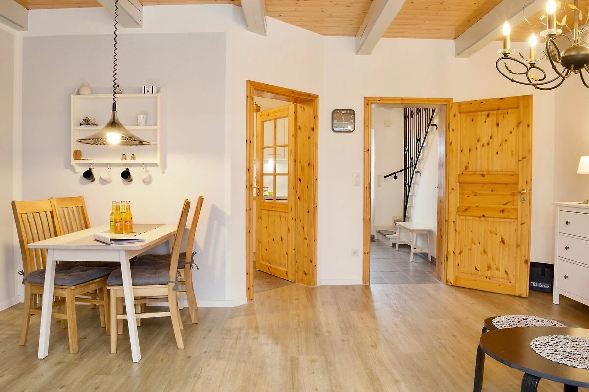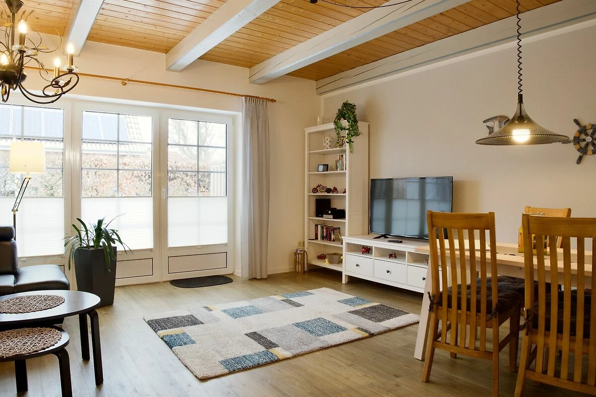 Im Erdgeschoss befindet sich der offen gestaltete Wohn- und Essbereich. Grosse Fenster sorgen für viel Tageslicht und schaffen eine angenehme, offene Atmosphäre. Die sichtbare Holzbalkendecke verleiht dem Raum zusätzlichen Charakter und unterstreicht den nordischen Stil. Der Wohnbereich ist gemütlich eingerichtet und mit einem Smart-TV ausgestattet. Von hier aus gelangen Sie direkt auf die möblierte Aussenterrasse, die sich ideal für Mahlzeiten im Freien oder ruhige Stunden an der frischen Luft eignet. Ein Strandkorb ergänzt den Aussenbereich.